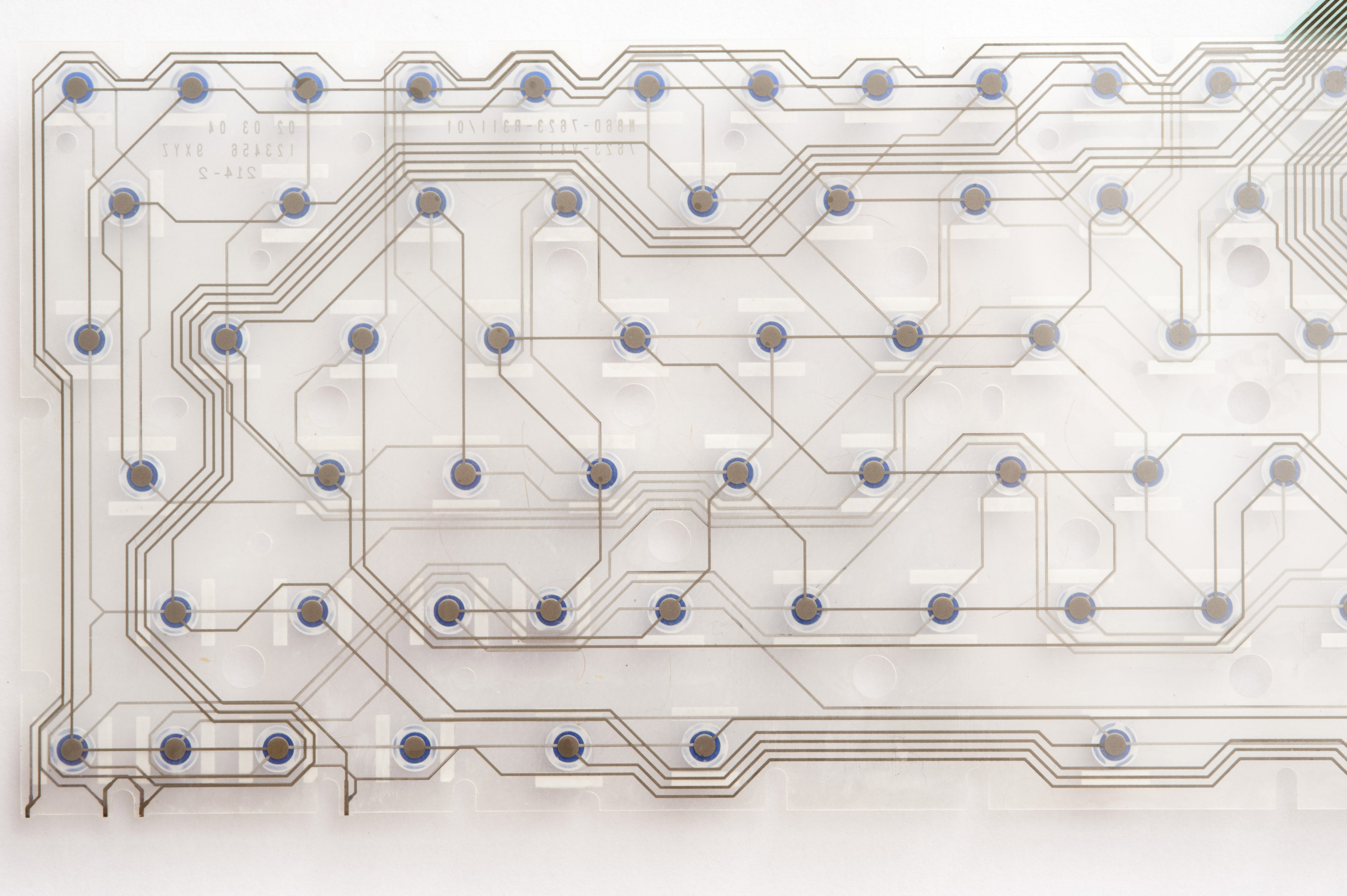 Keywords: electronics, close-up, buttons, circuit, dots, flexible, keyboard, layout, scheme, transparent, white, background, abstract, keys, computer, tracks, trace, geometric