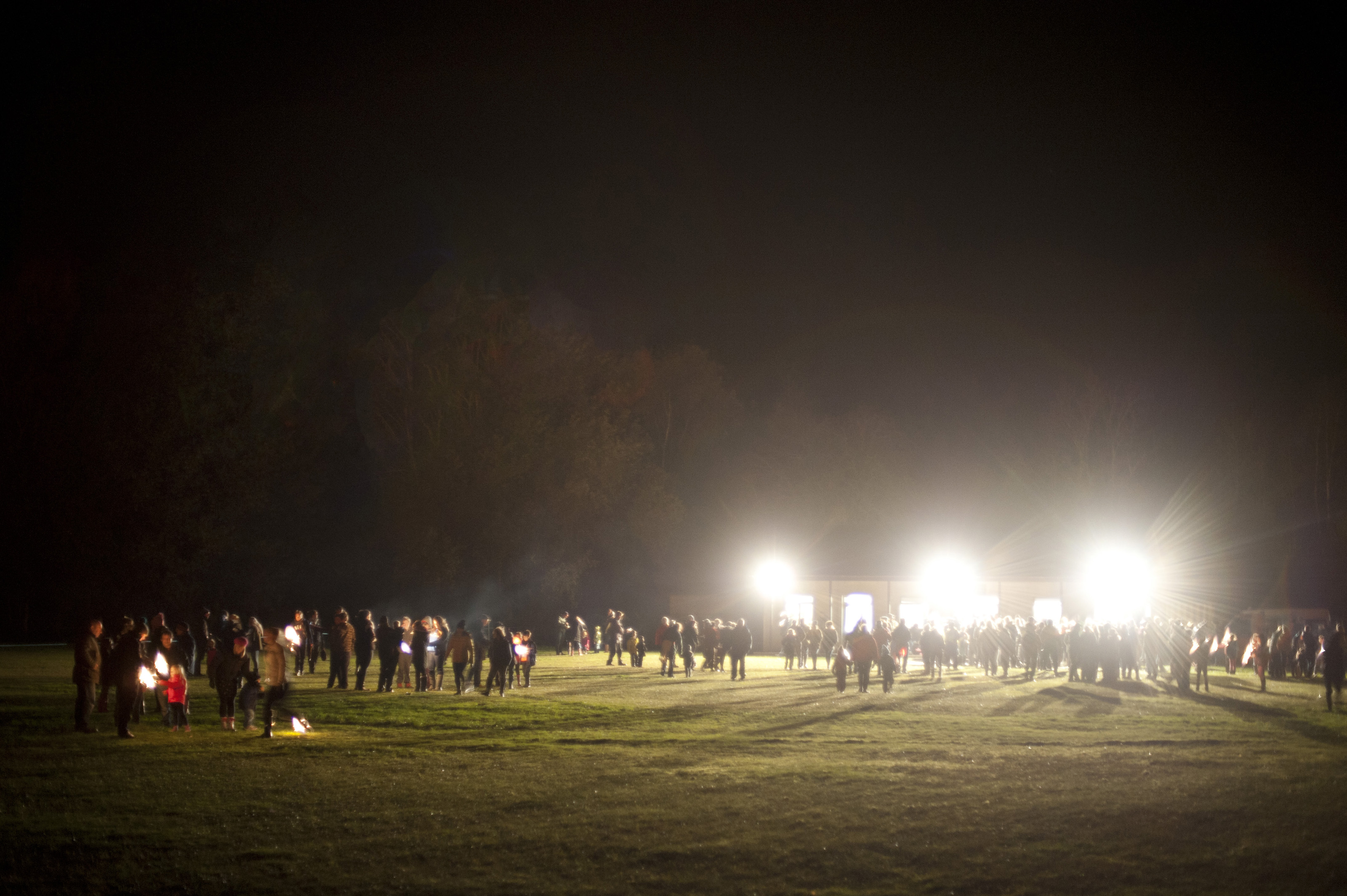 Three bright floodlights lighting a festival with crowds of people gathered on a field to celebrate Bonfire Night on the 5th November