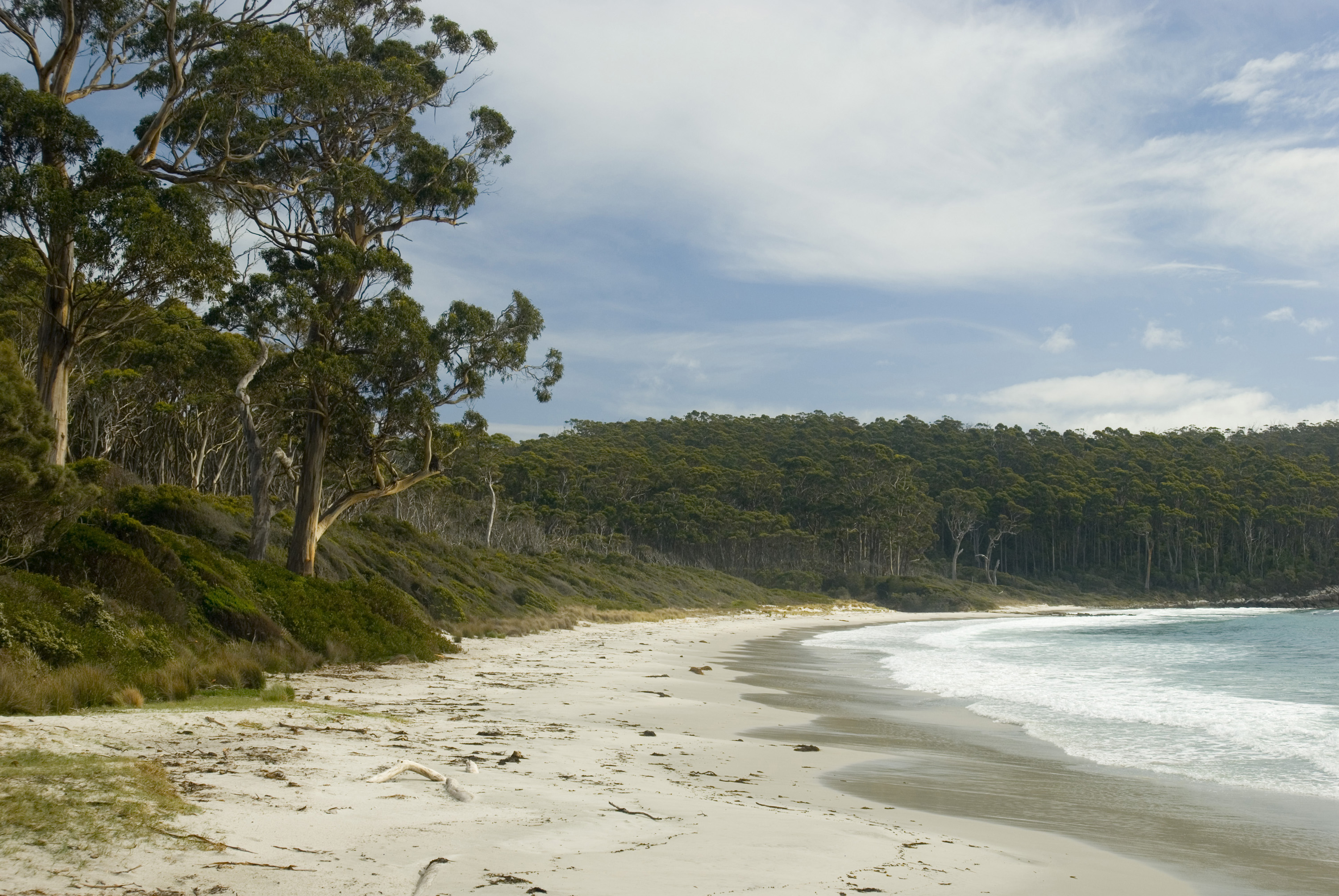 Keywords: tasmania, australia, ocean, beach, seashore, coast, sandy, curved, fortescue bay, surf, cloudy, deserted, waves, scenery, topography