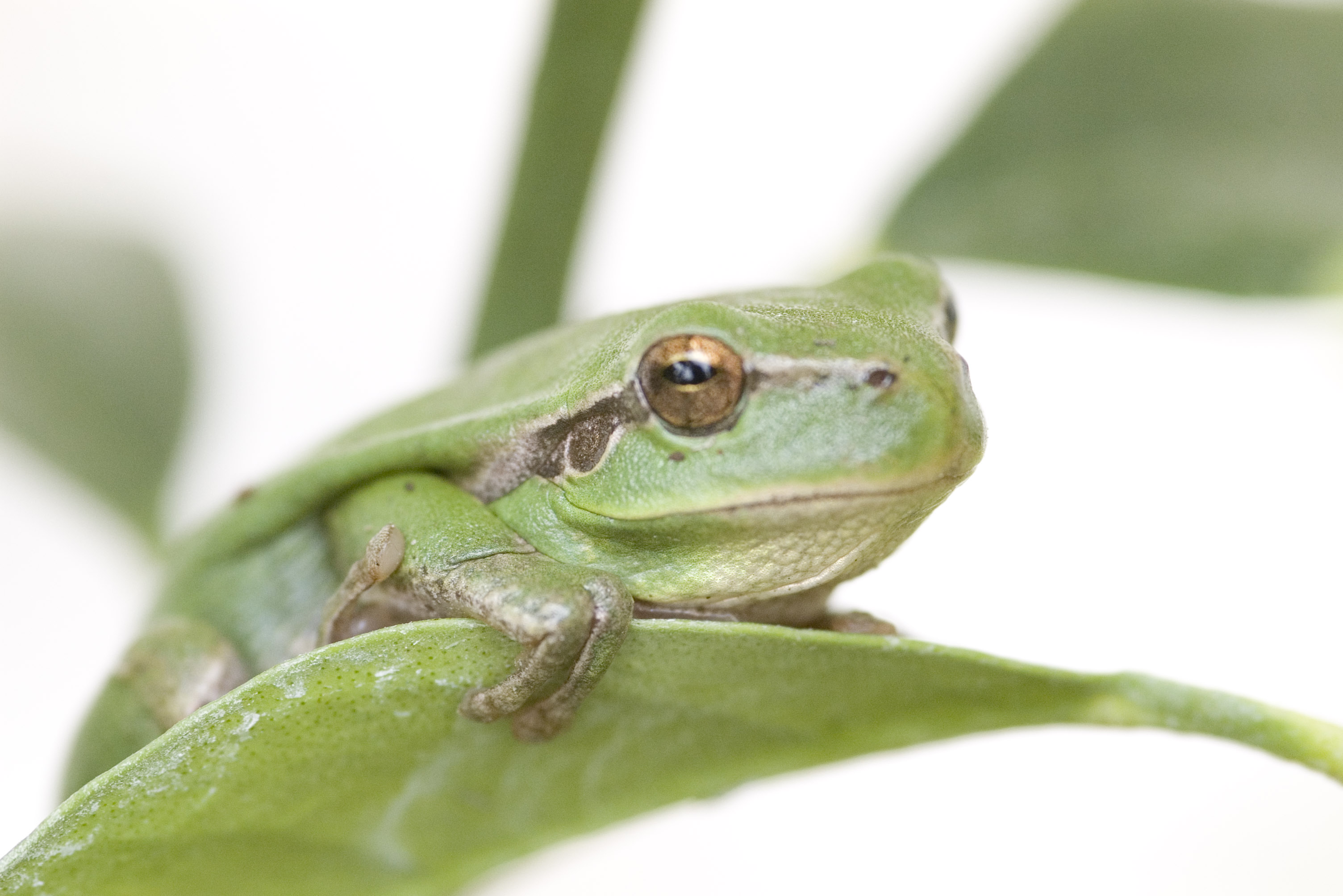 a small green tree frog on a leaf