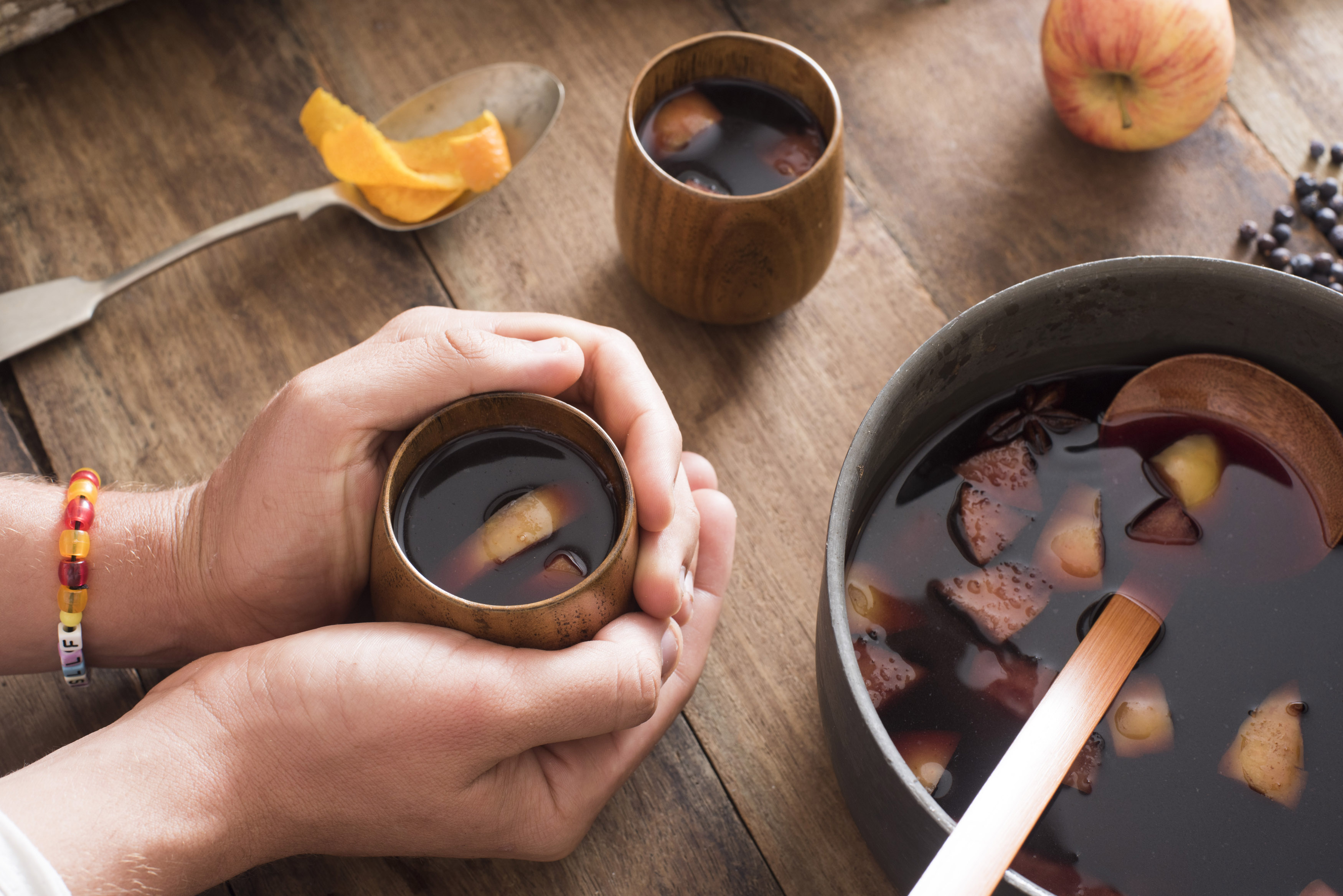 Person warming their hands on a mug of spicy fruity mulled wine seated at a table with a pot of freshly made brew
