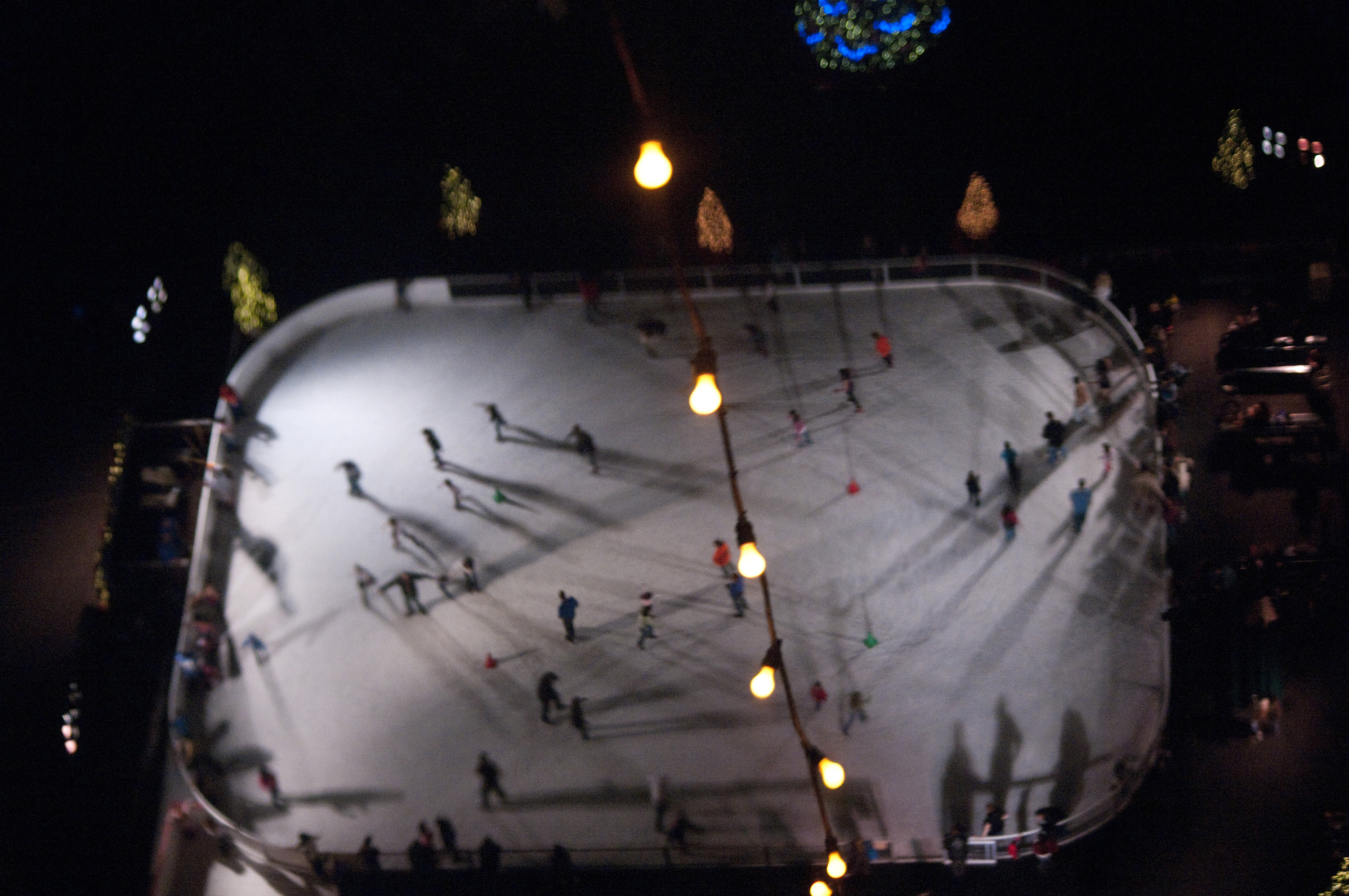 looking down on at skaters on a christmas ice rink