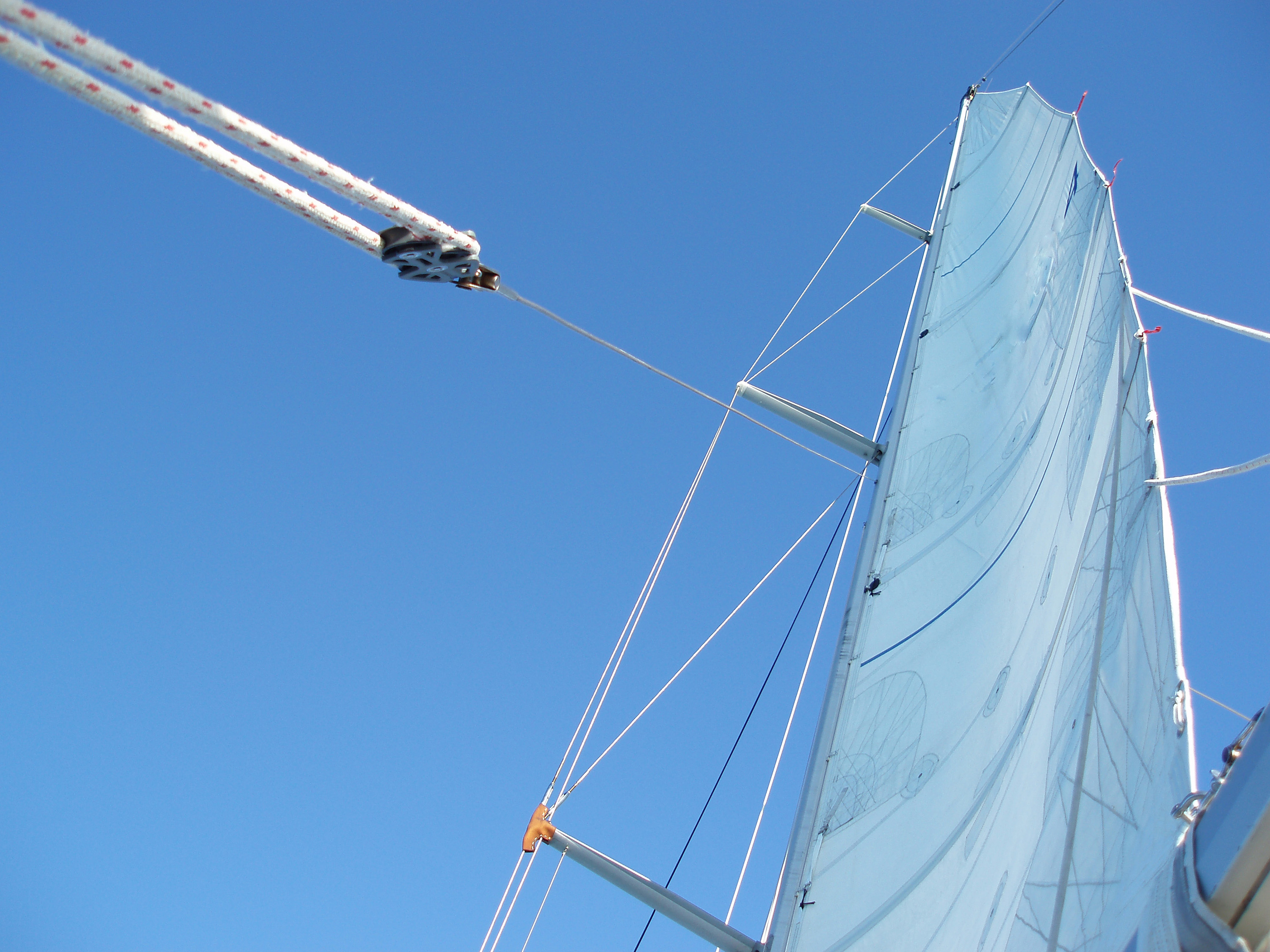 Keywords: sail, boom, yacht, sailing, sail, yachting, blue, sky, low angle, upwards, rigging, mast, copyspace, copy space, space for text