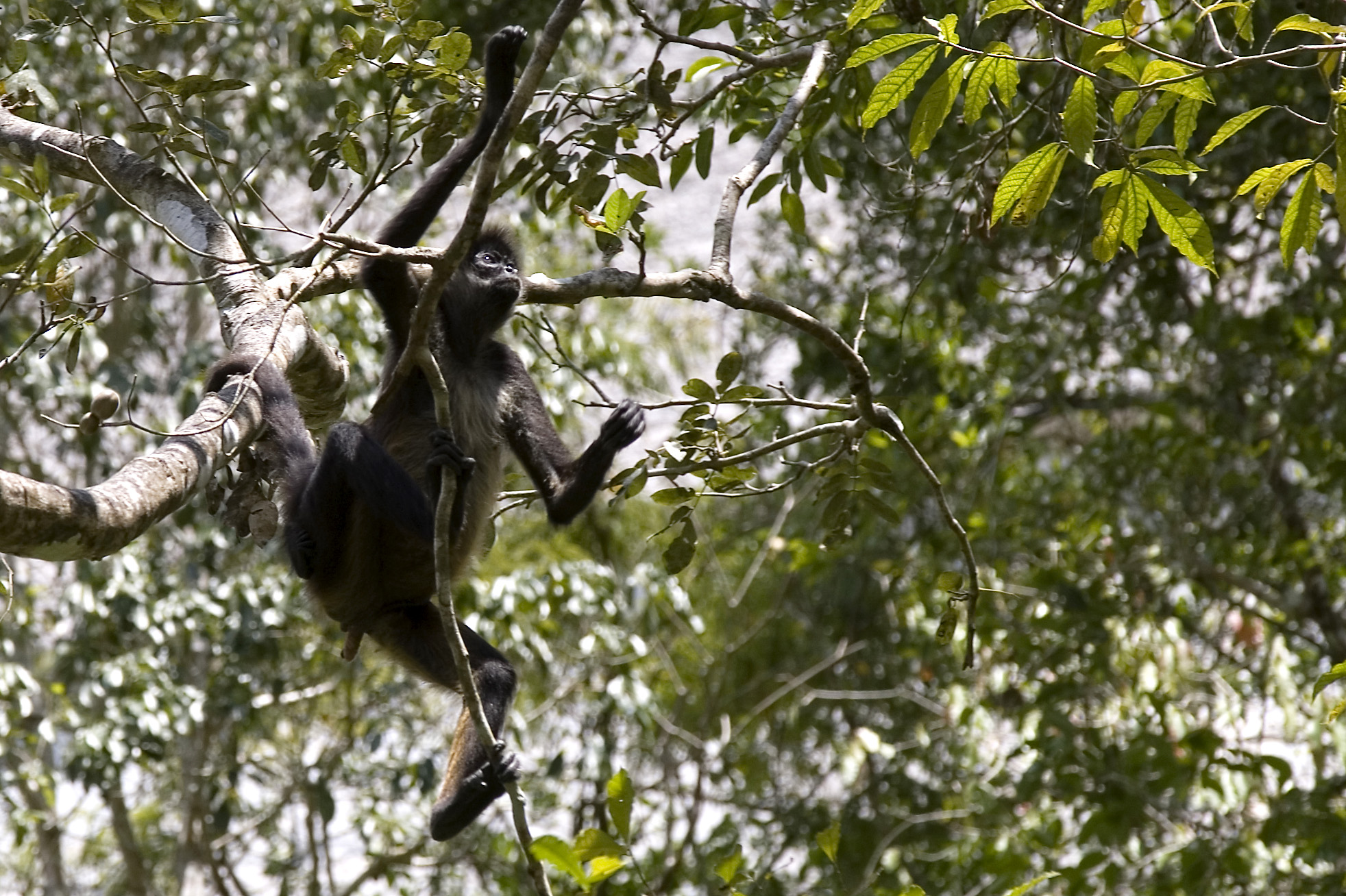 a black monkey hanging in a jungle tree, Tikal, Guatemala