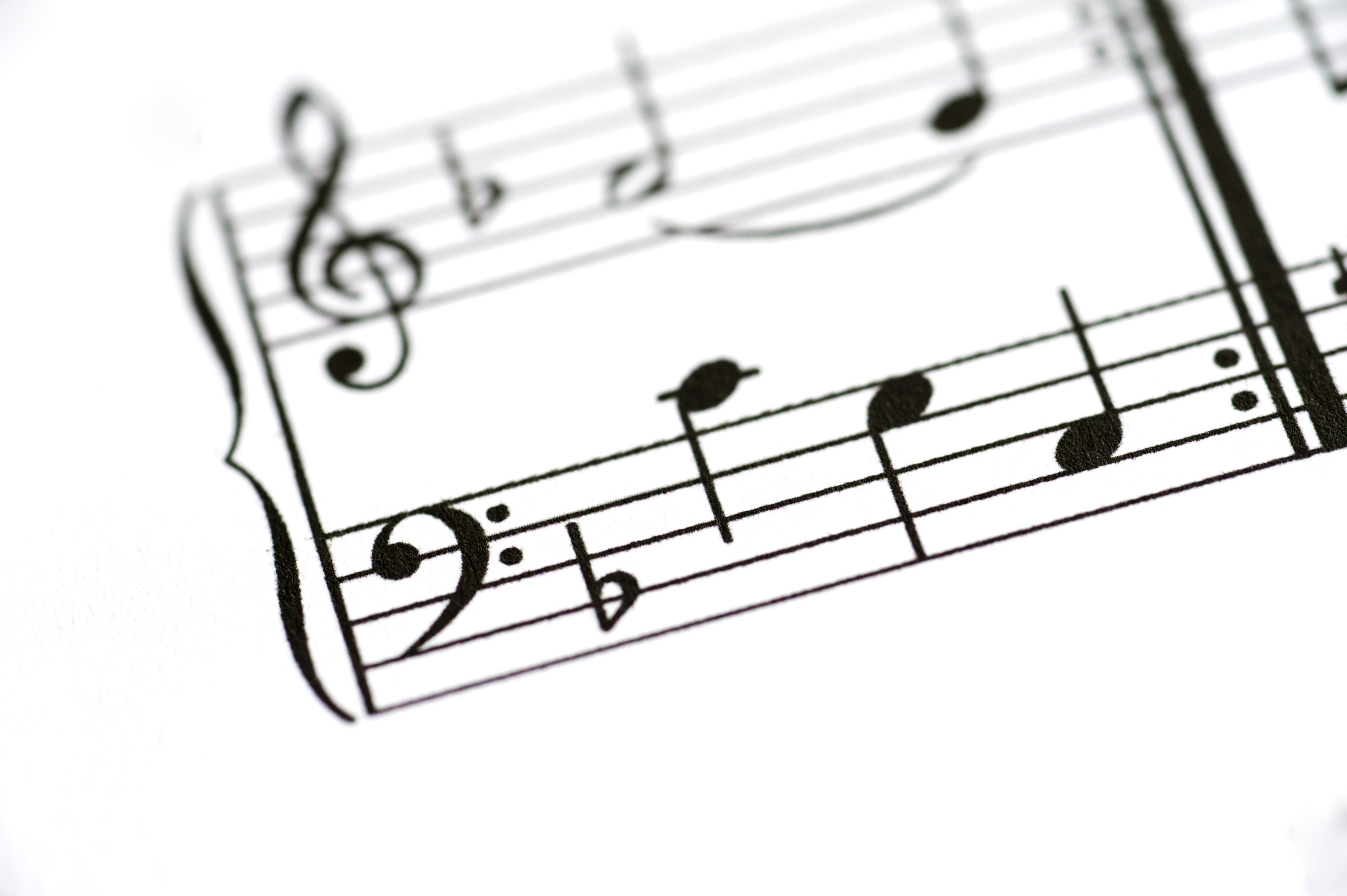 a close up image of a sheet of printed music with the focus on the base clef on a music staf