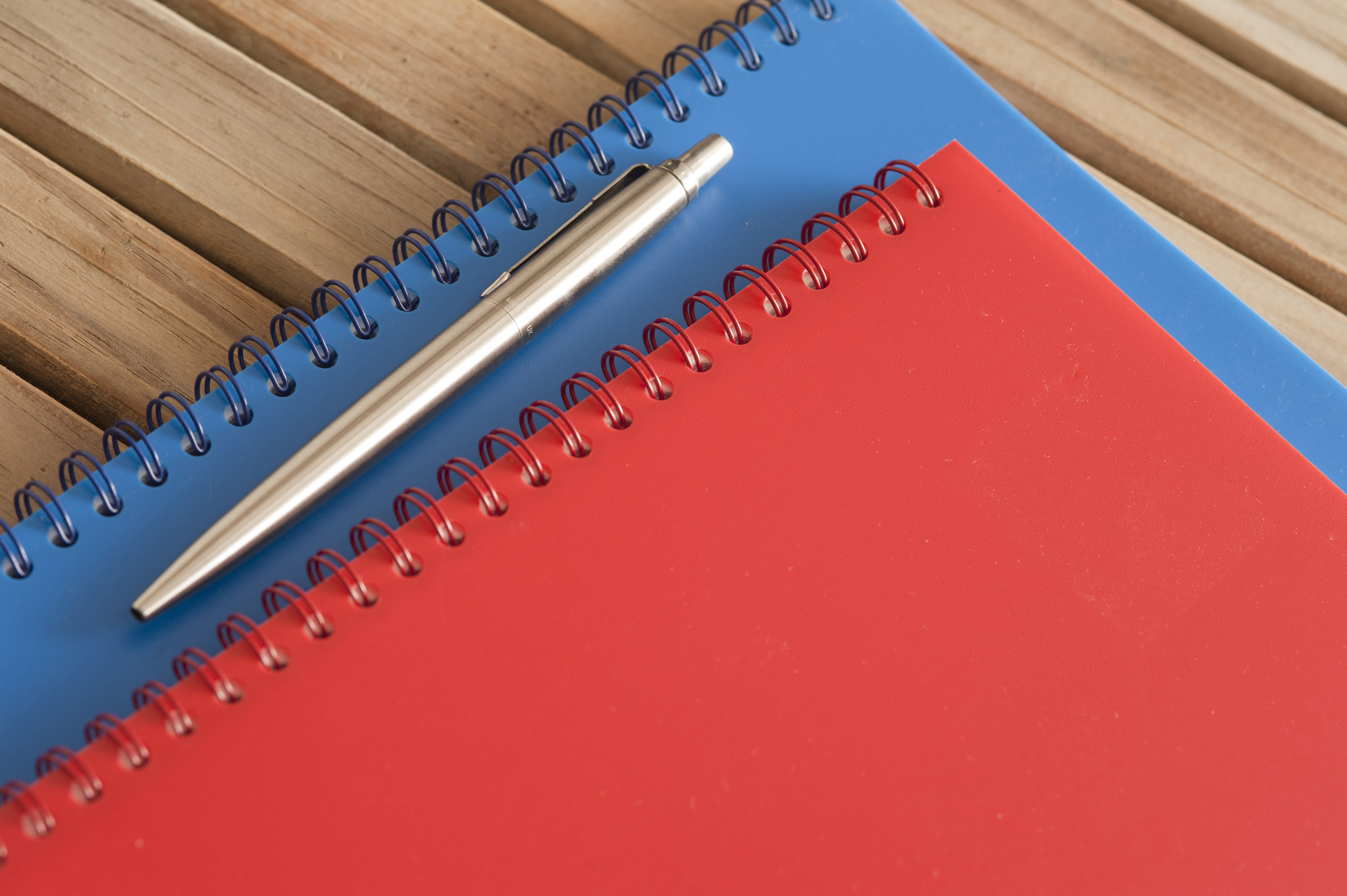 Close up Spiral Blue and Red Office Notebooks with Silver Ballpoint Pen on Top Placed on the Wooden Table.