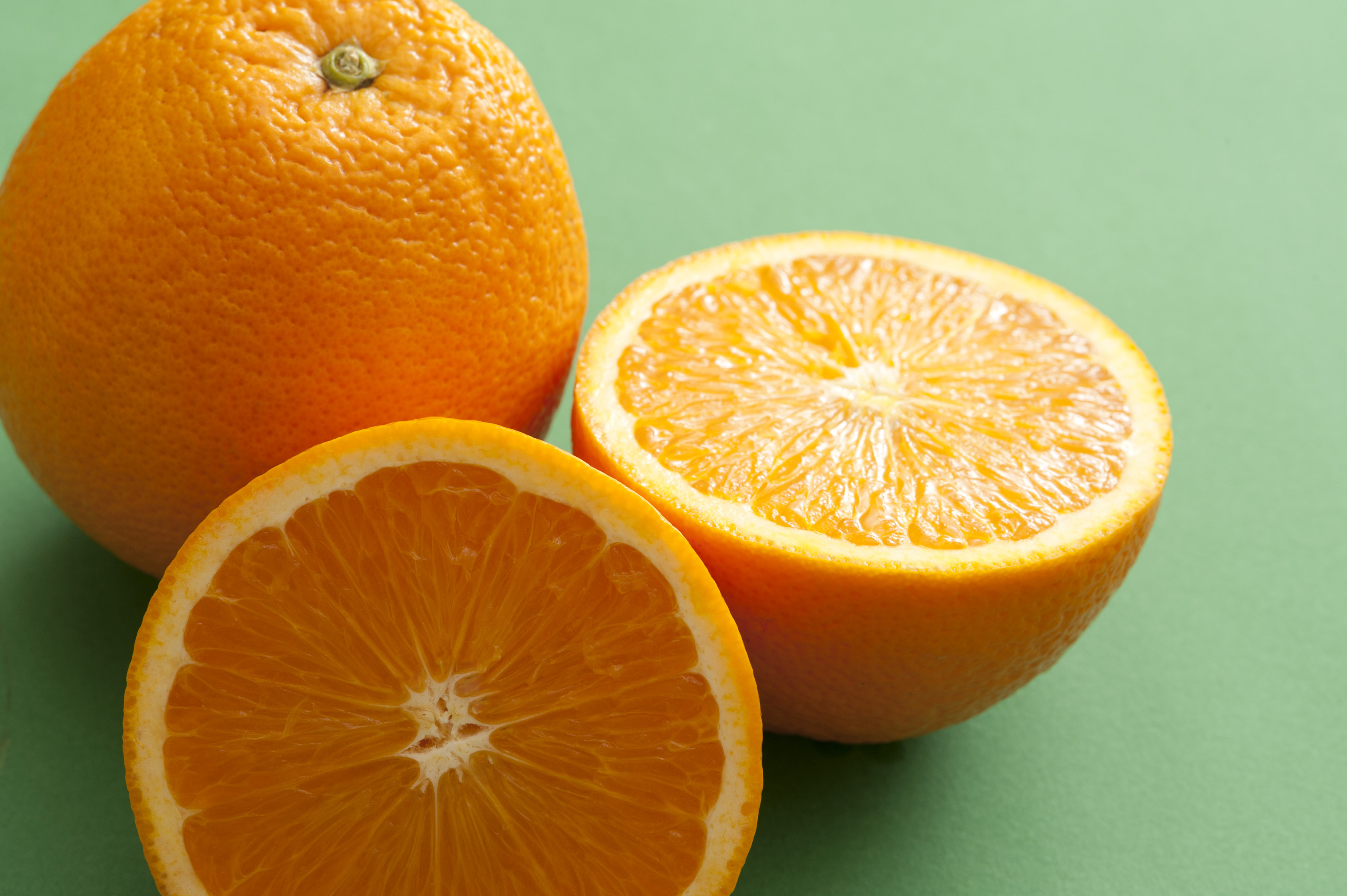 Whole and halved juicy fresh orange over a green background in a healthy diet and nutrition concept