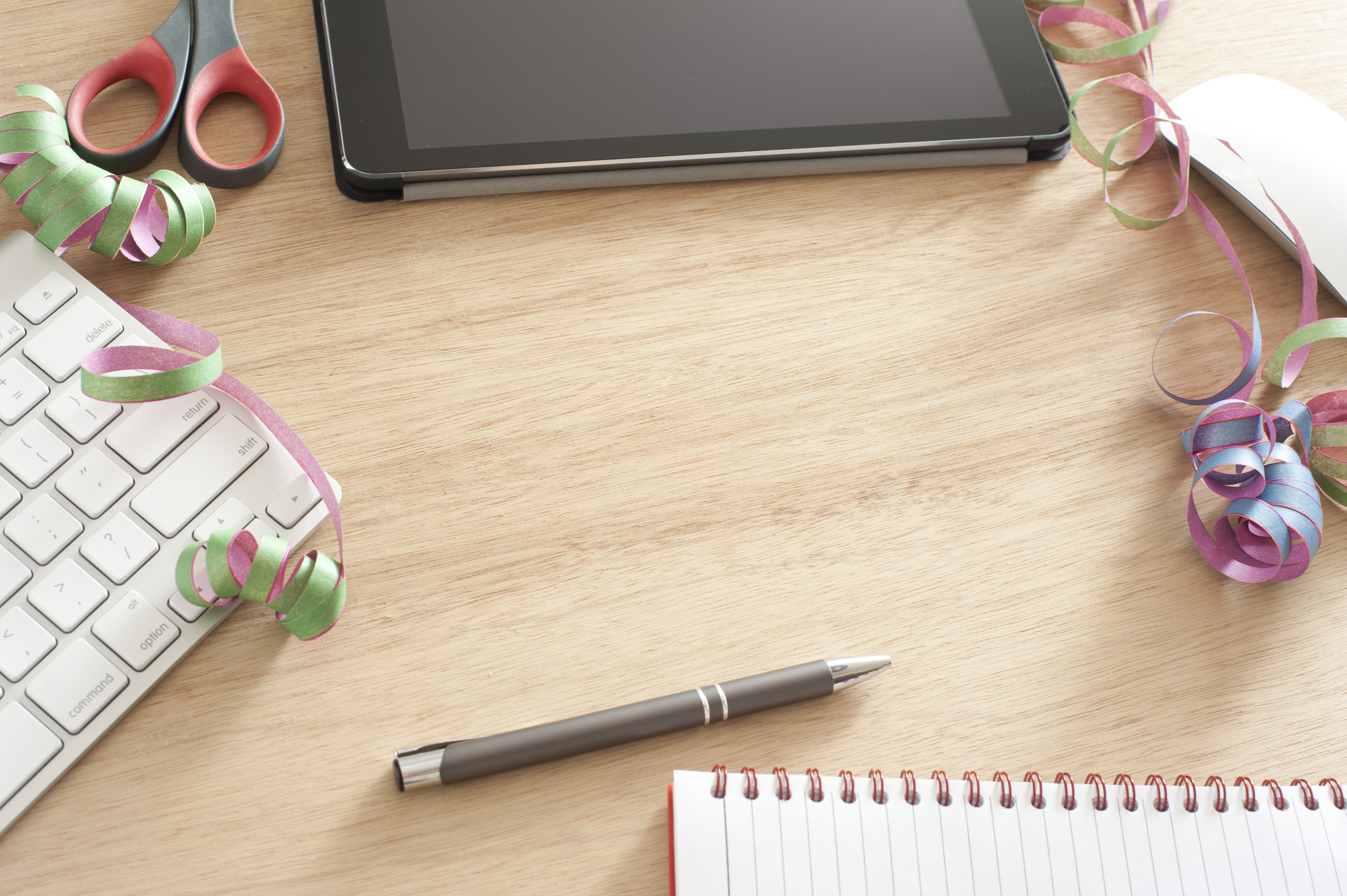 Pleasing background with copy space surrounded by keyboard, pen, notebook, tablet computer, ribbon and scissors