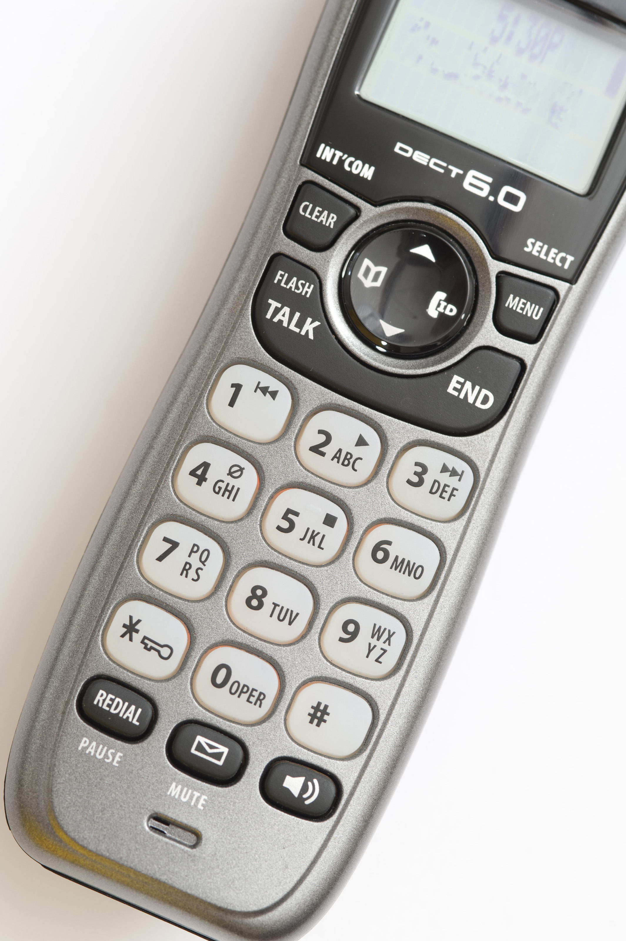 Telephone handset and receiver viewed from above showing the keypad with the numbers, letters, screen and functions on a white background