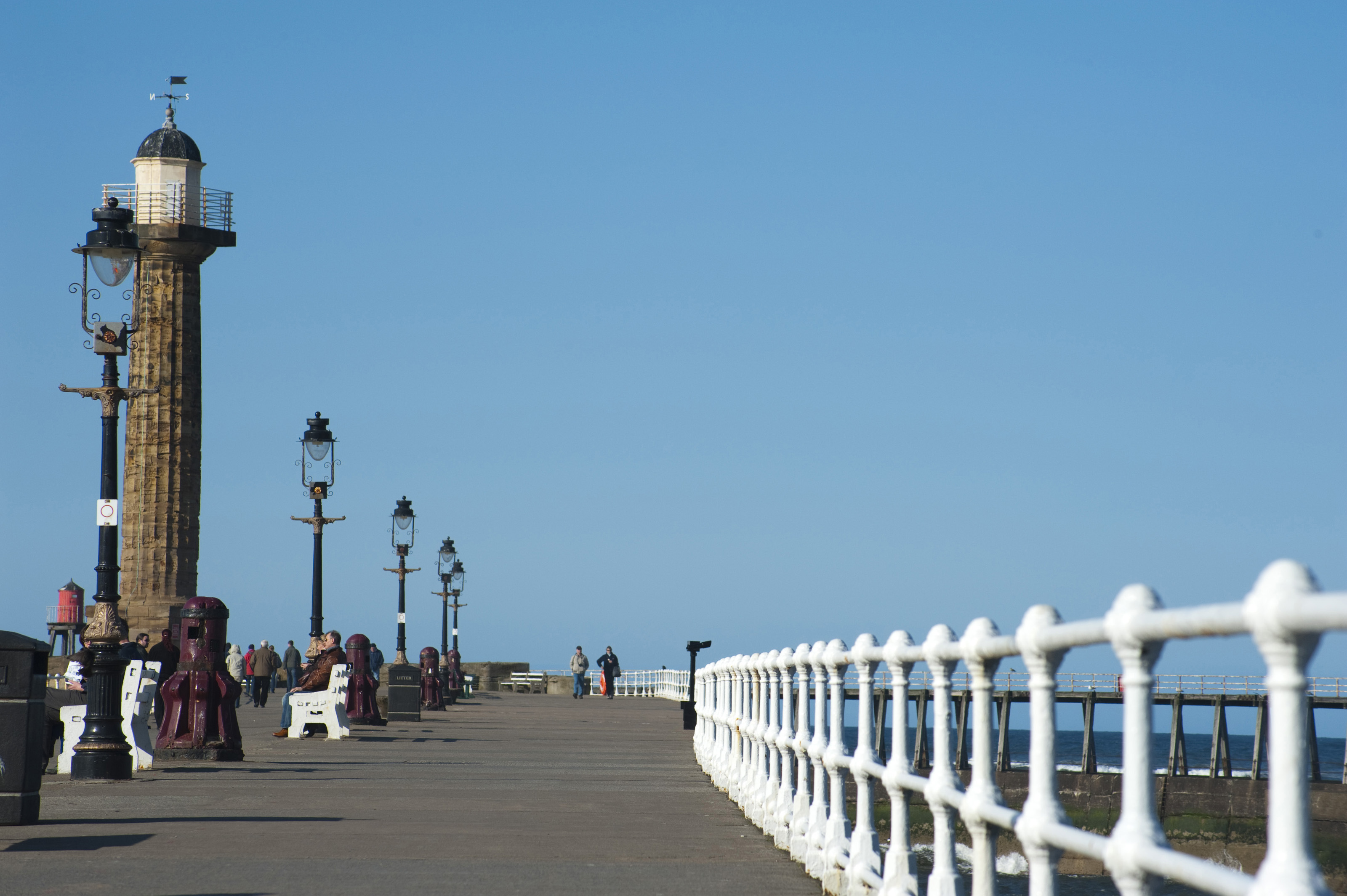 Keywords: lamp, light, entrance, pier, walkway, warning, lighthouse, west, navigation, beacon, landmark, guide, england, railing, promenade, harbour, defence, seawall, whitby, north yorkshire