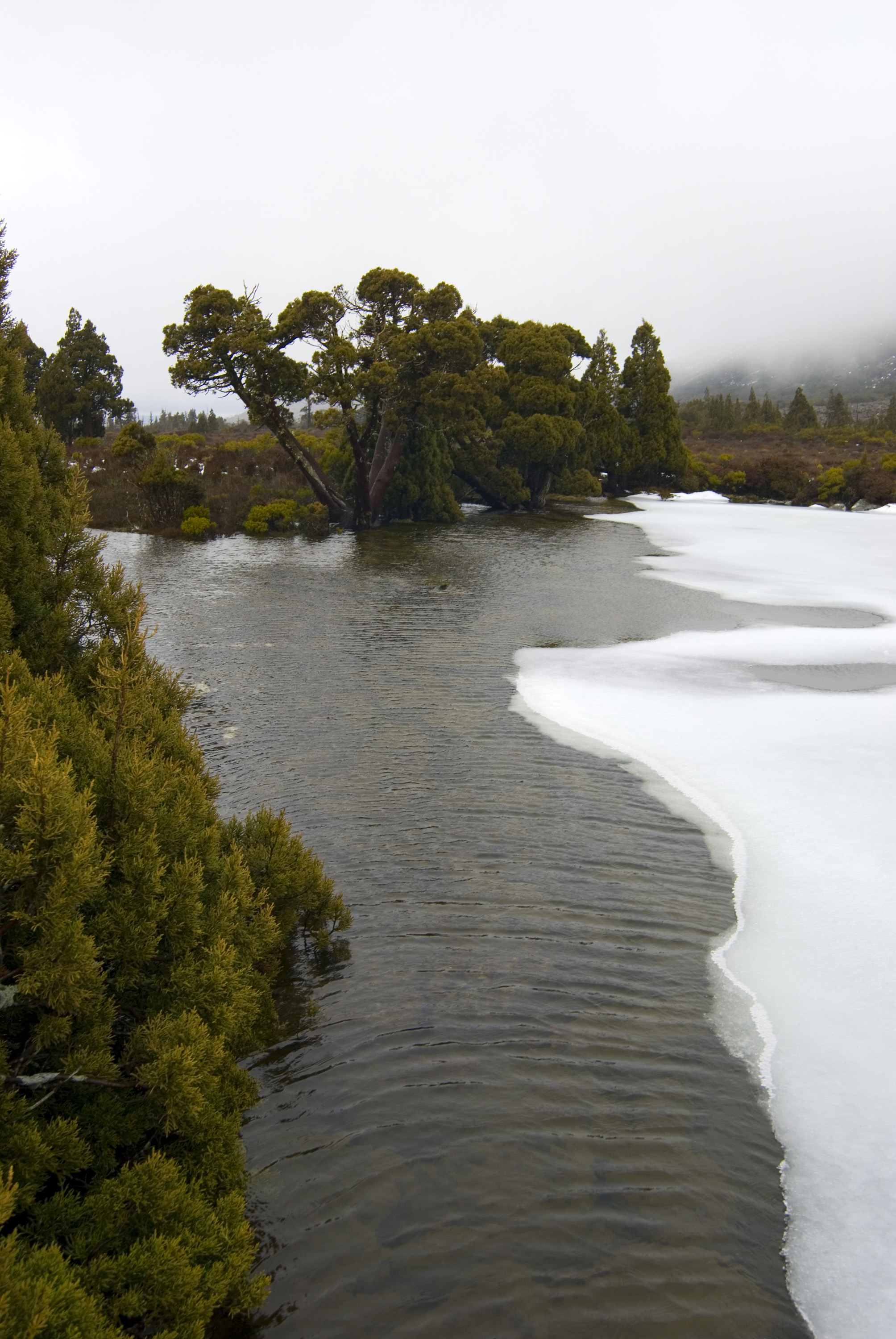 partly frozen over, pine lake, central highlands, alpine tasmania