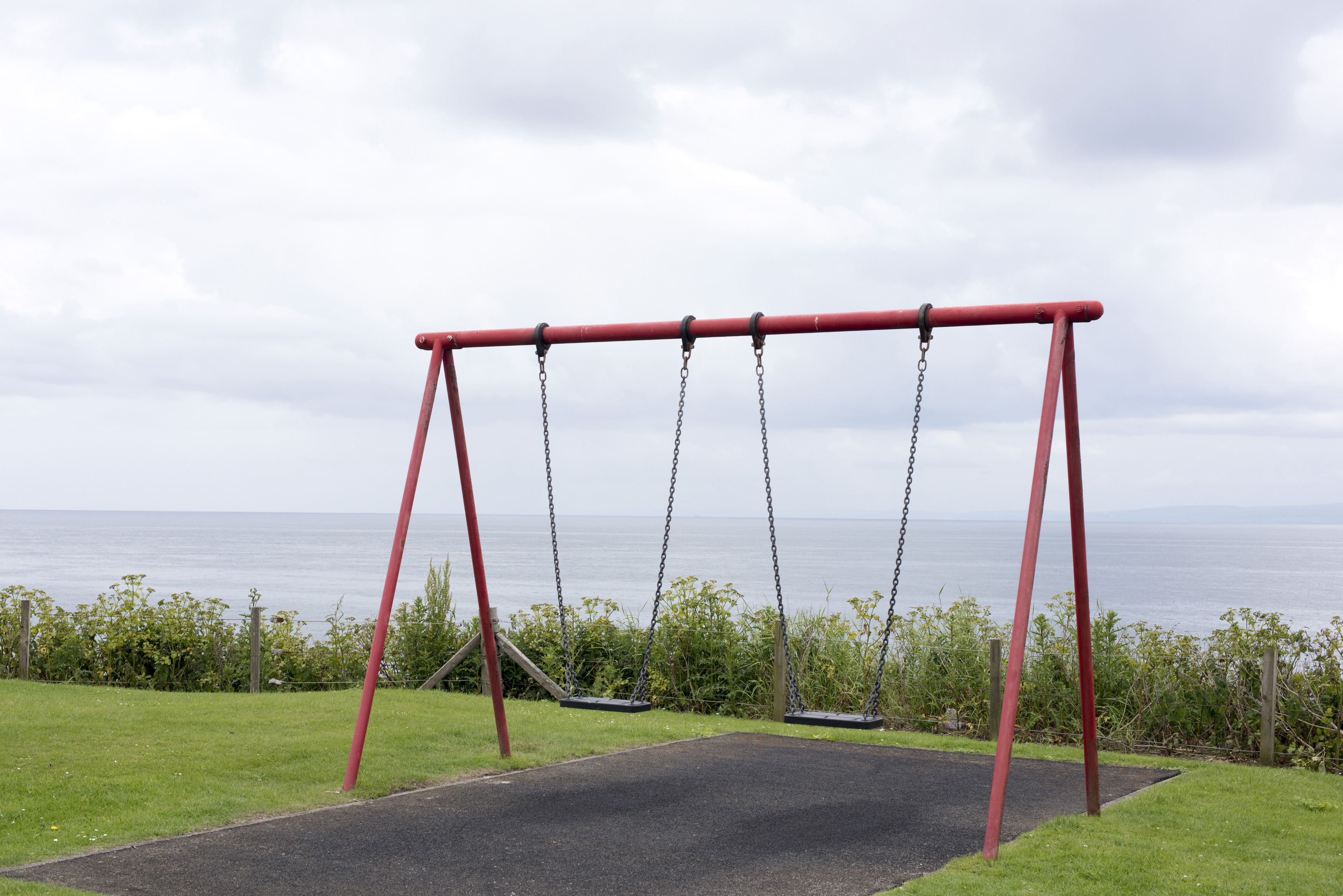 Keywords: entertainment, equipment, kids, playground, recreation, a-frame, cloudy, coast, ocean, sea, swings, empty, red, recreational, activity