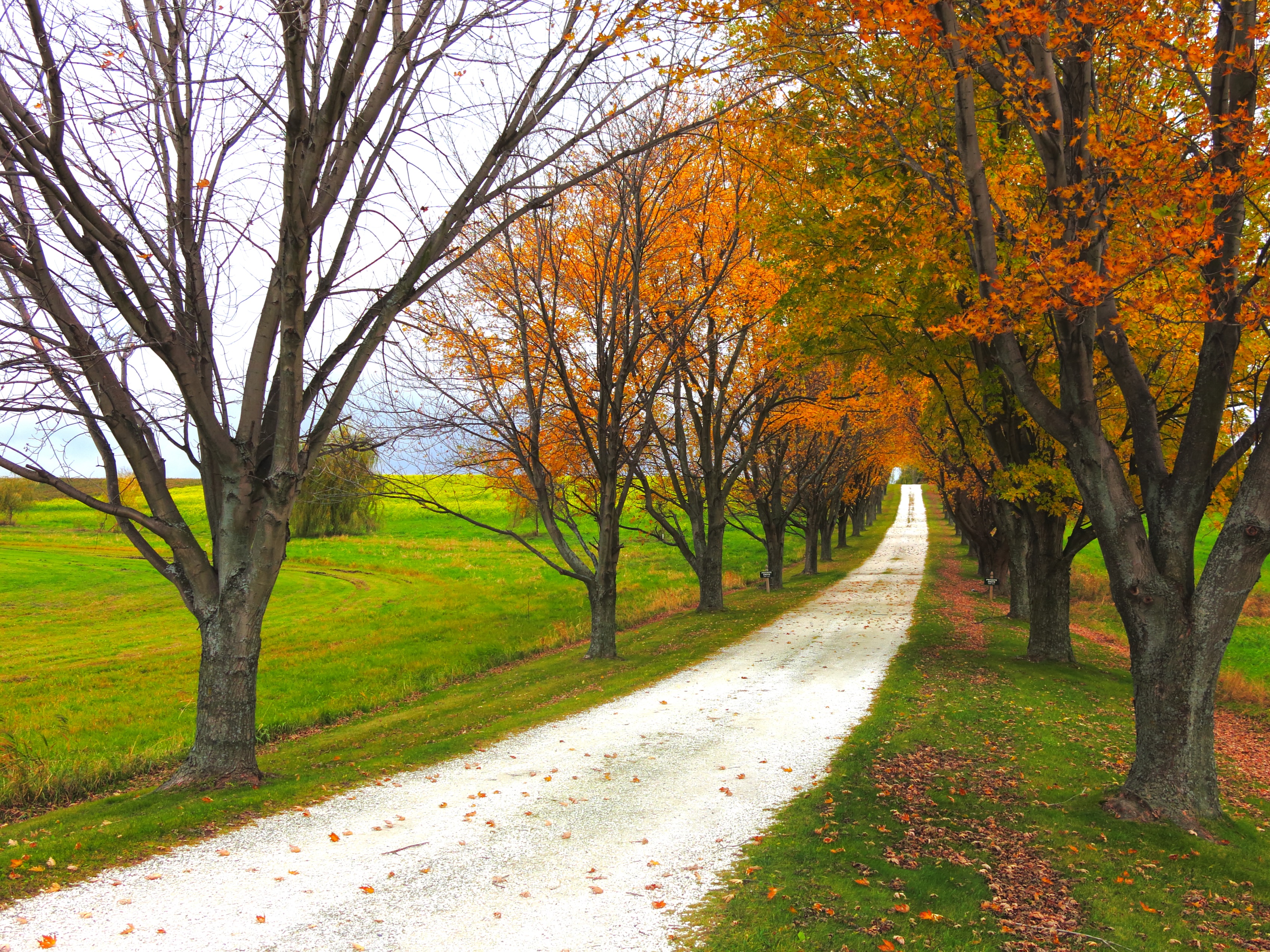 Autumn foliage with trees lining a dirt road leading to the horizon with bright, green grass on an overcast morning.