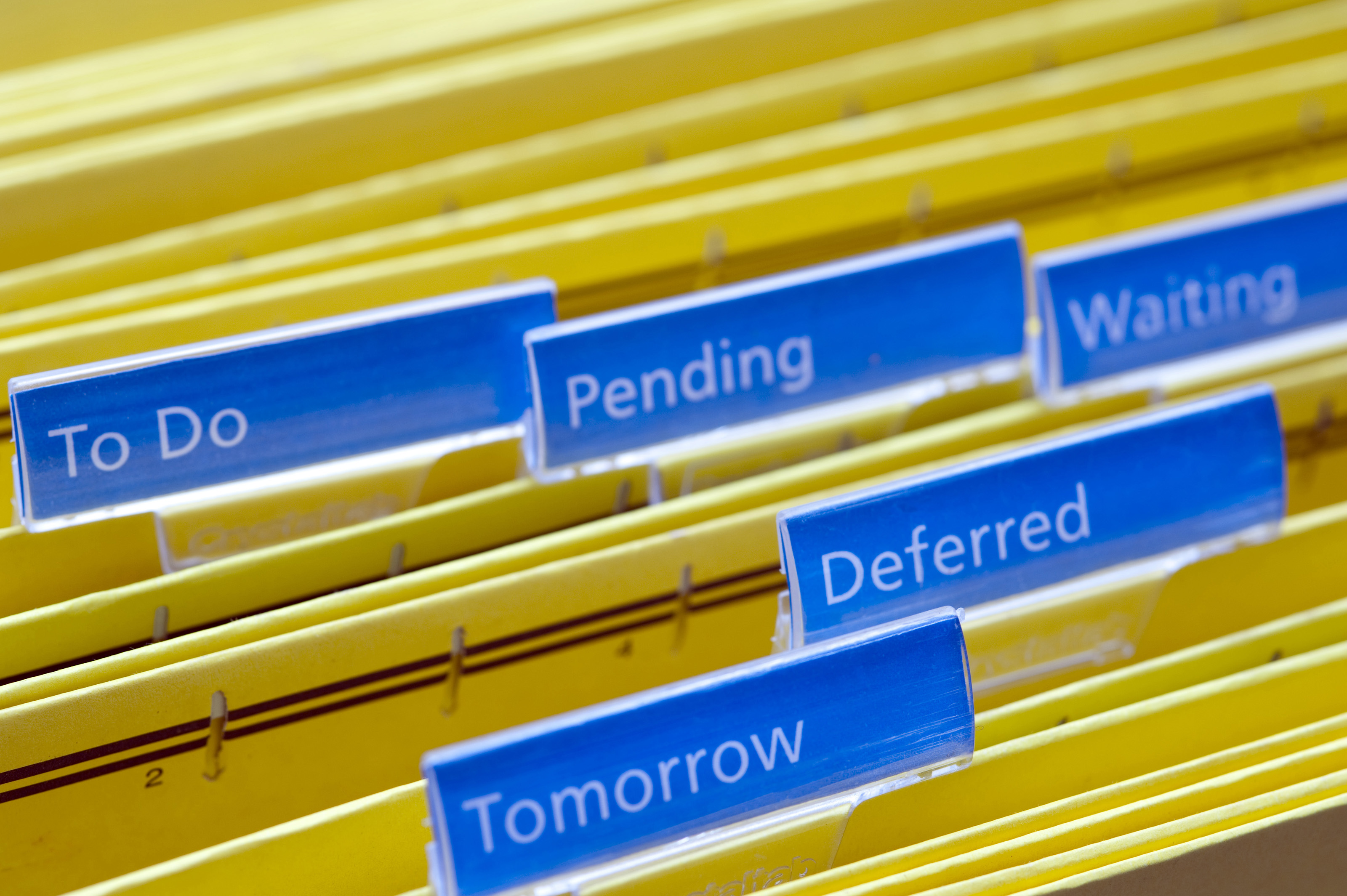 Keywords: deferment, files, filing, lazy, office, organization, pending, procrastination, stationery, tomorrow, waiting, deferred, to do, labels, business, blue, yellow