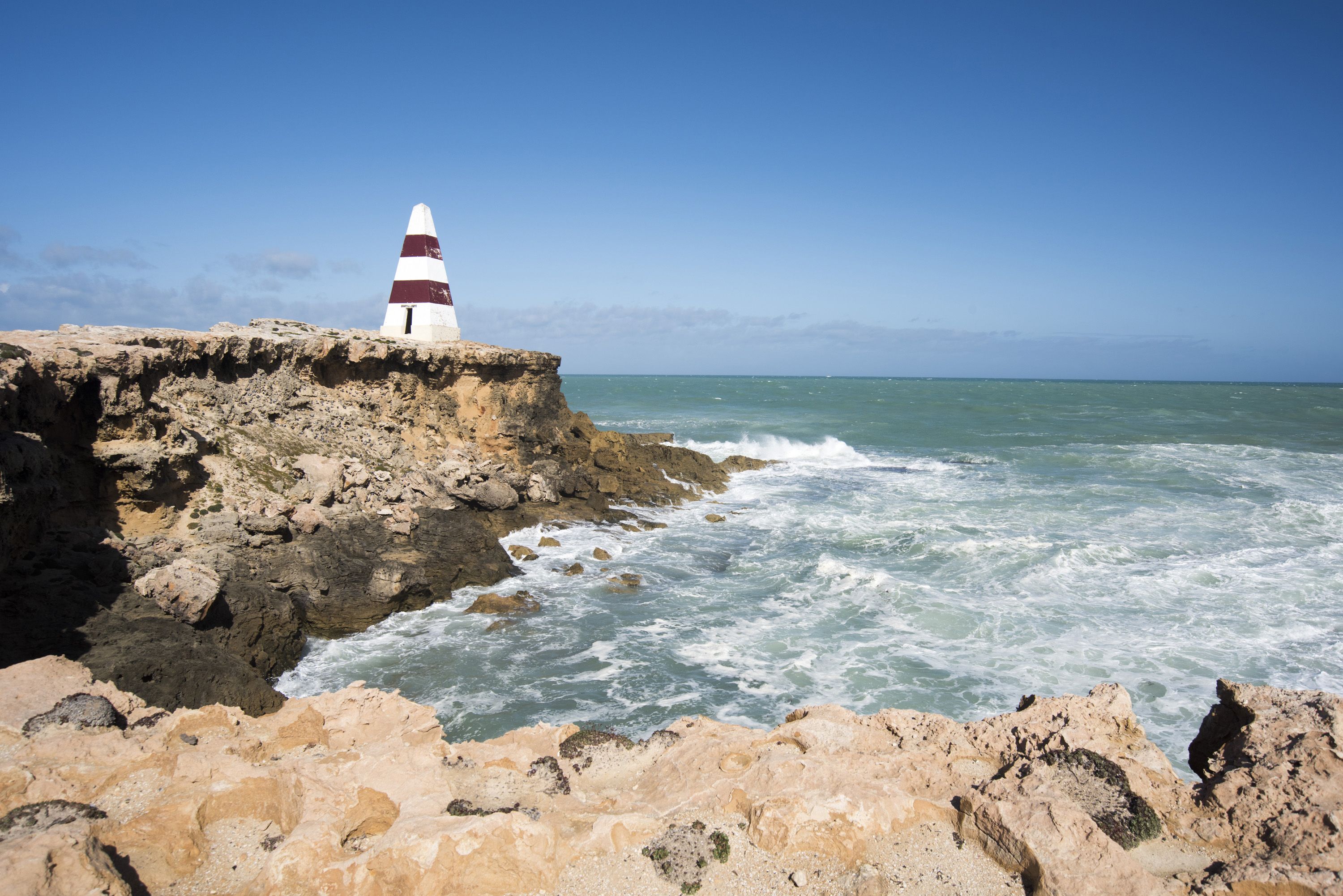 Rough seas on the coast of Robe Australia with the Robe Obelisk on a rocky headland with eroded cliffs viewed from a clifftop vantage point or lookout