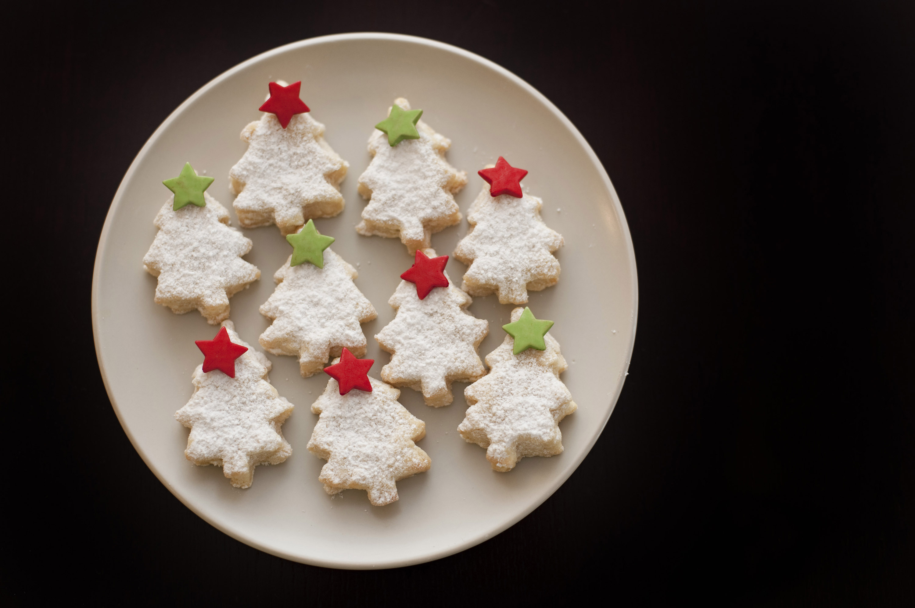 Keywords: baked, baking, biscuits, christmas, christmas tree, confectionery, cookies, decorative, festive, food, holiday, homemade, icing sugar, overhead, pastries, plate, seasonal, stars, tree cookies, xmas, icing, green, red