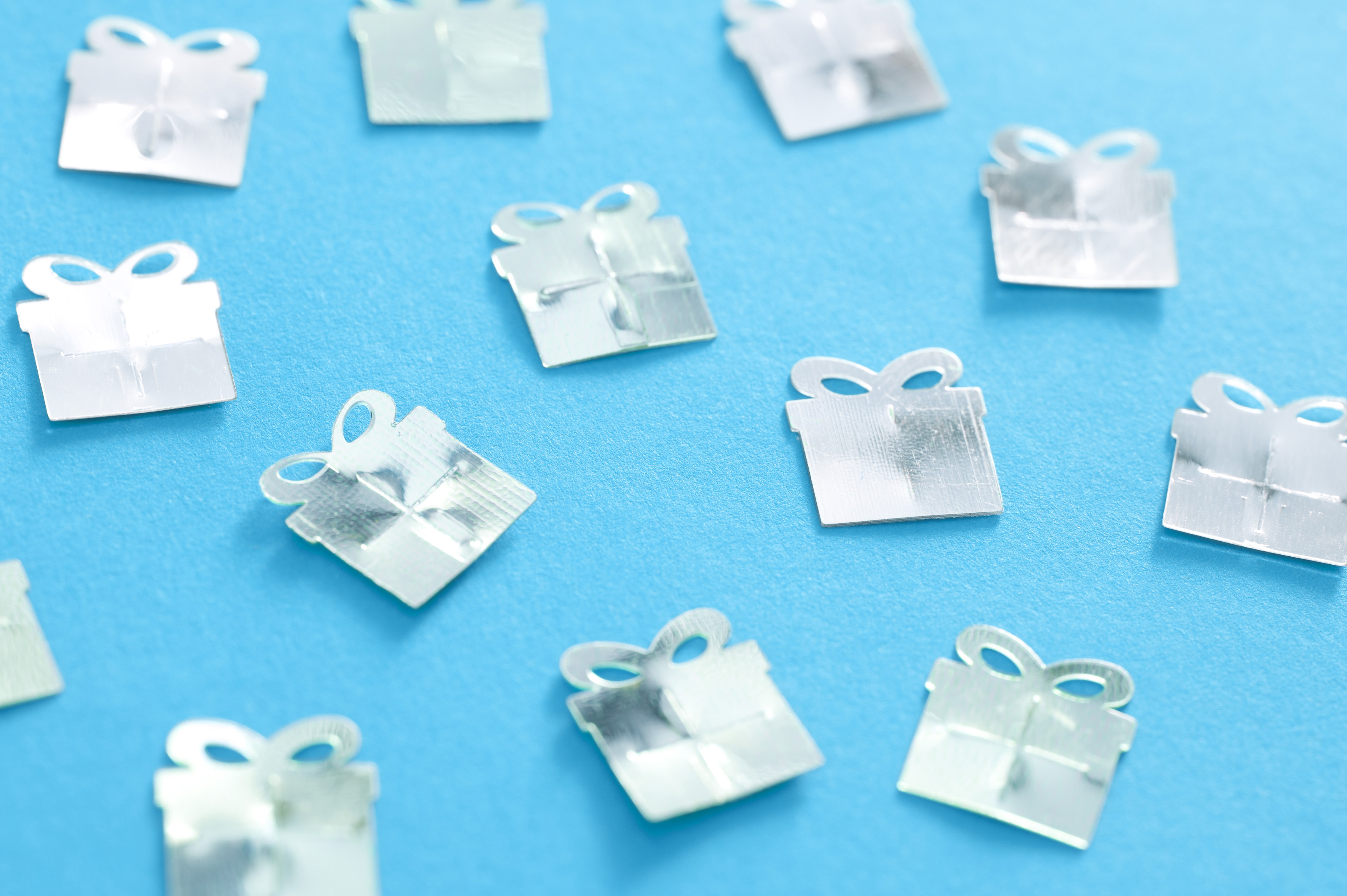 Keywords: above, confetti, celebration, party, blue, gift, present, silver, background, birthday, christmas, scattered, anniversary, wedding, festive