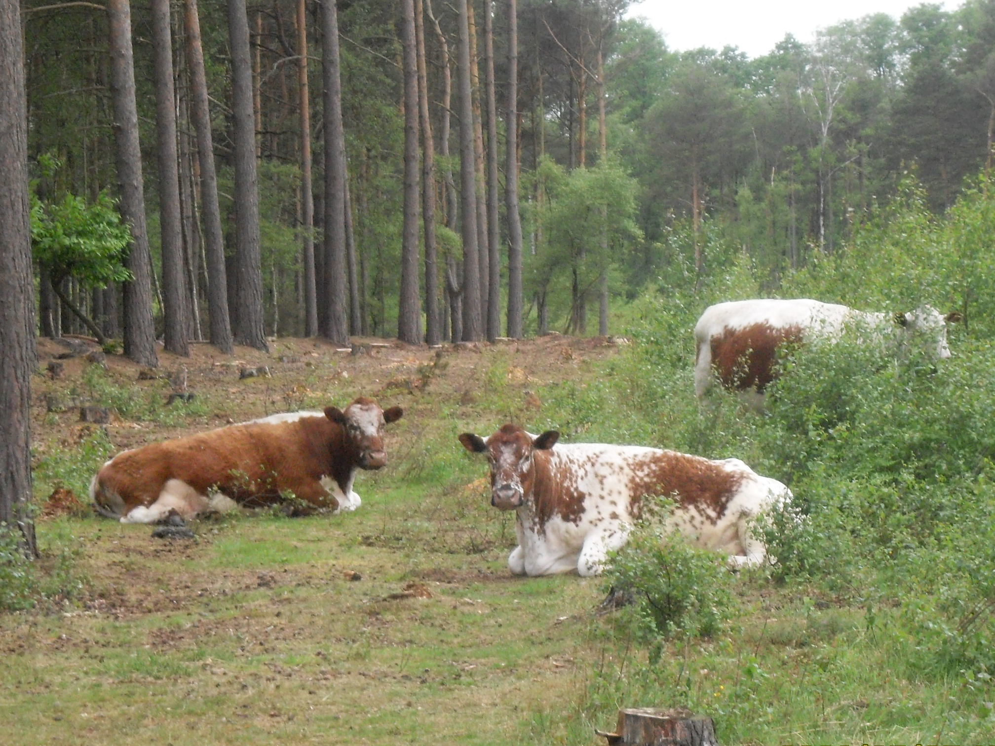 Rare breed of cattle in the pine woods near Fleet Hampshire England,