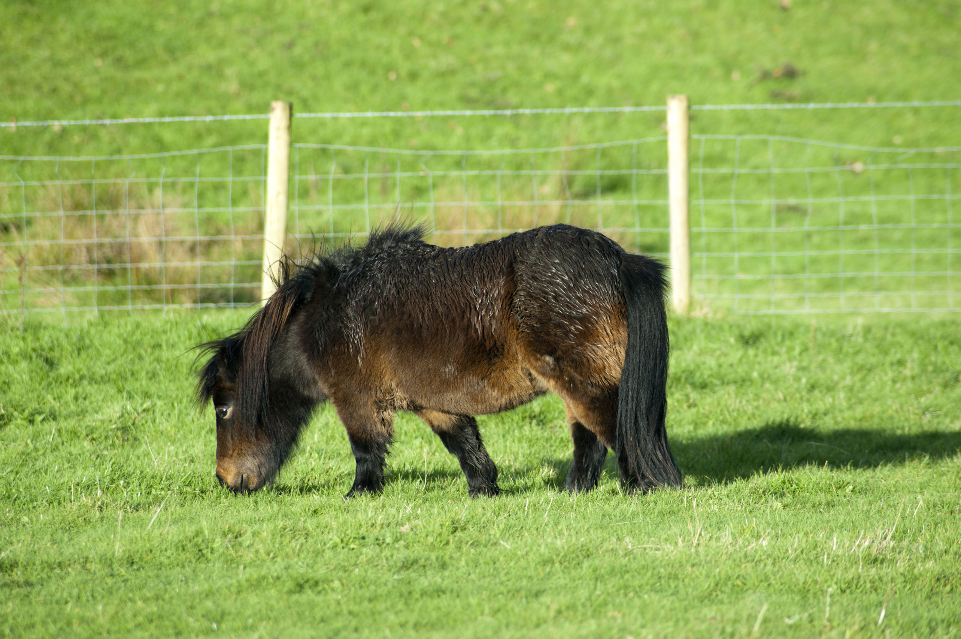 Keywords: animal, brown, fat, grazing, horse, miniature, paddock, pet, pony, shetland pony, brown, green