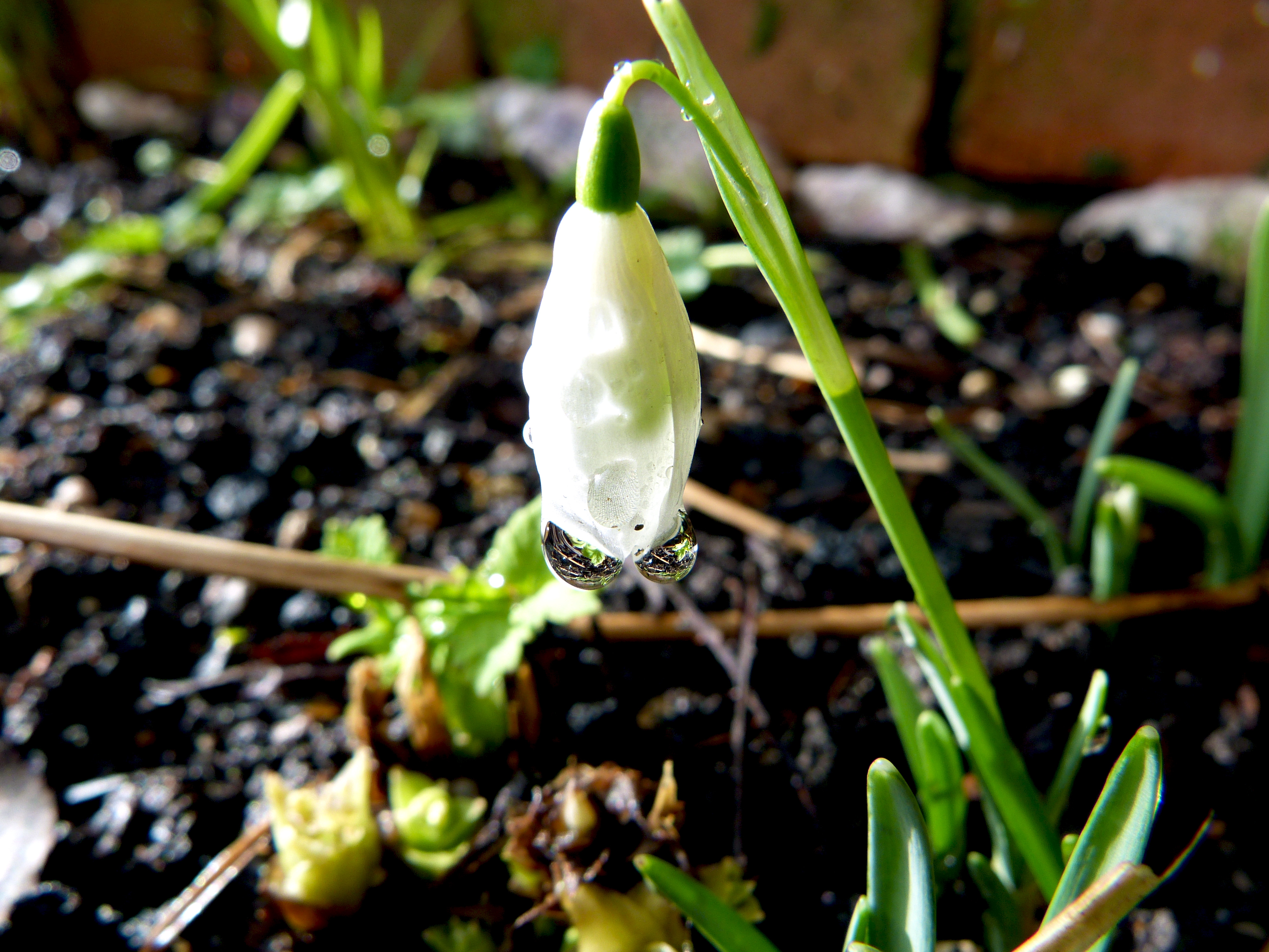 Keywords: nature, flower, snowdrop, water, water droplets, spring, garden, reflection, lenses, water lense
