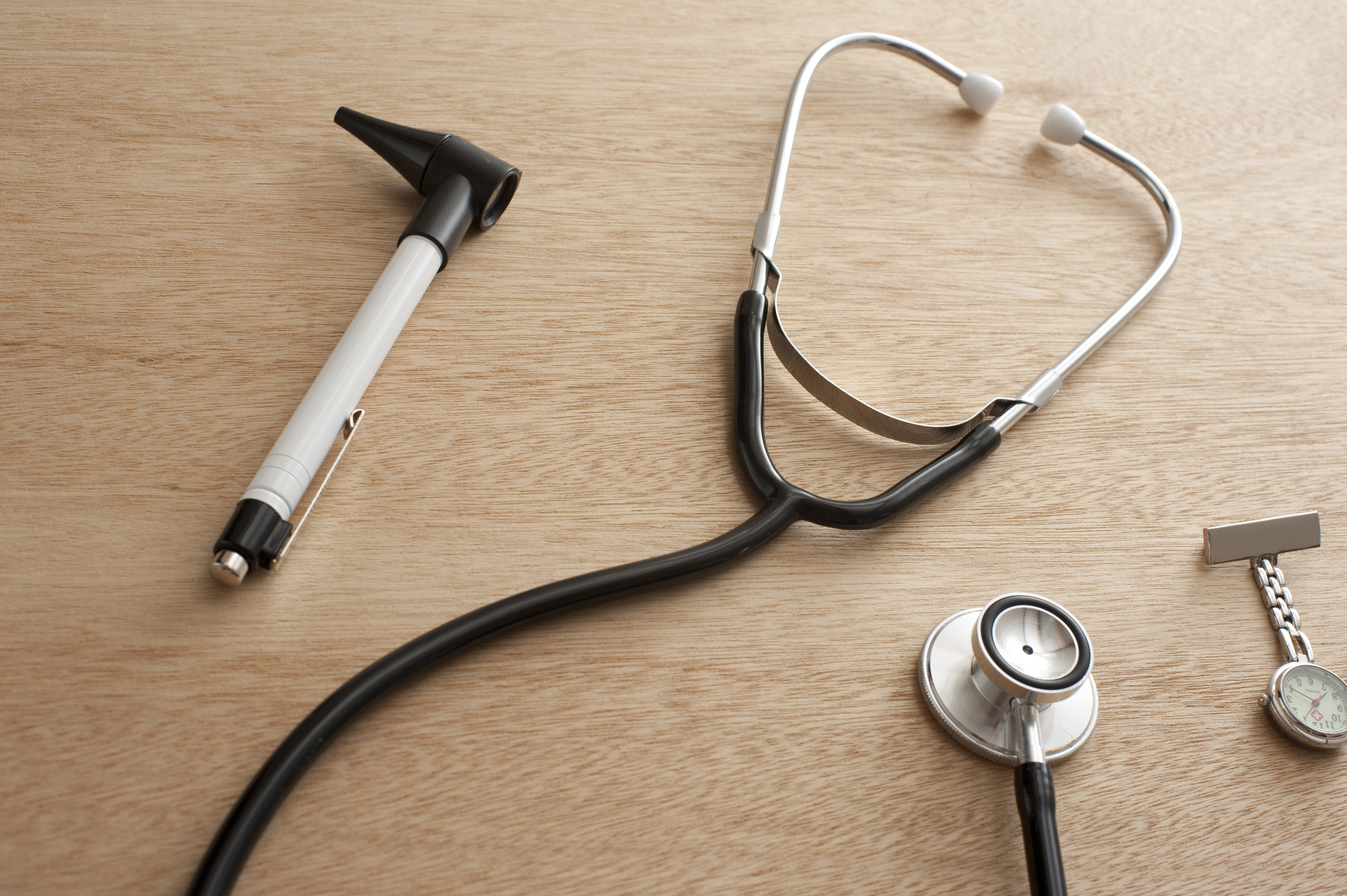 Otoscope, Stethoscope and Pocket Watch on Wooden Desk - Concept Image of Medical Supplies Scattered on Desk