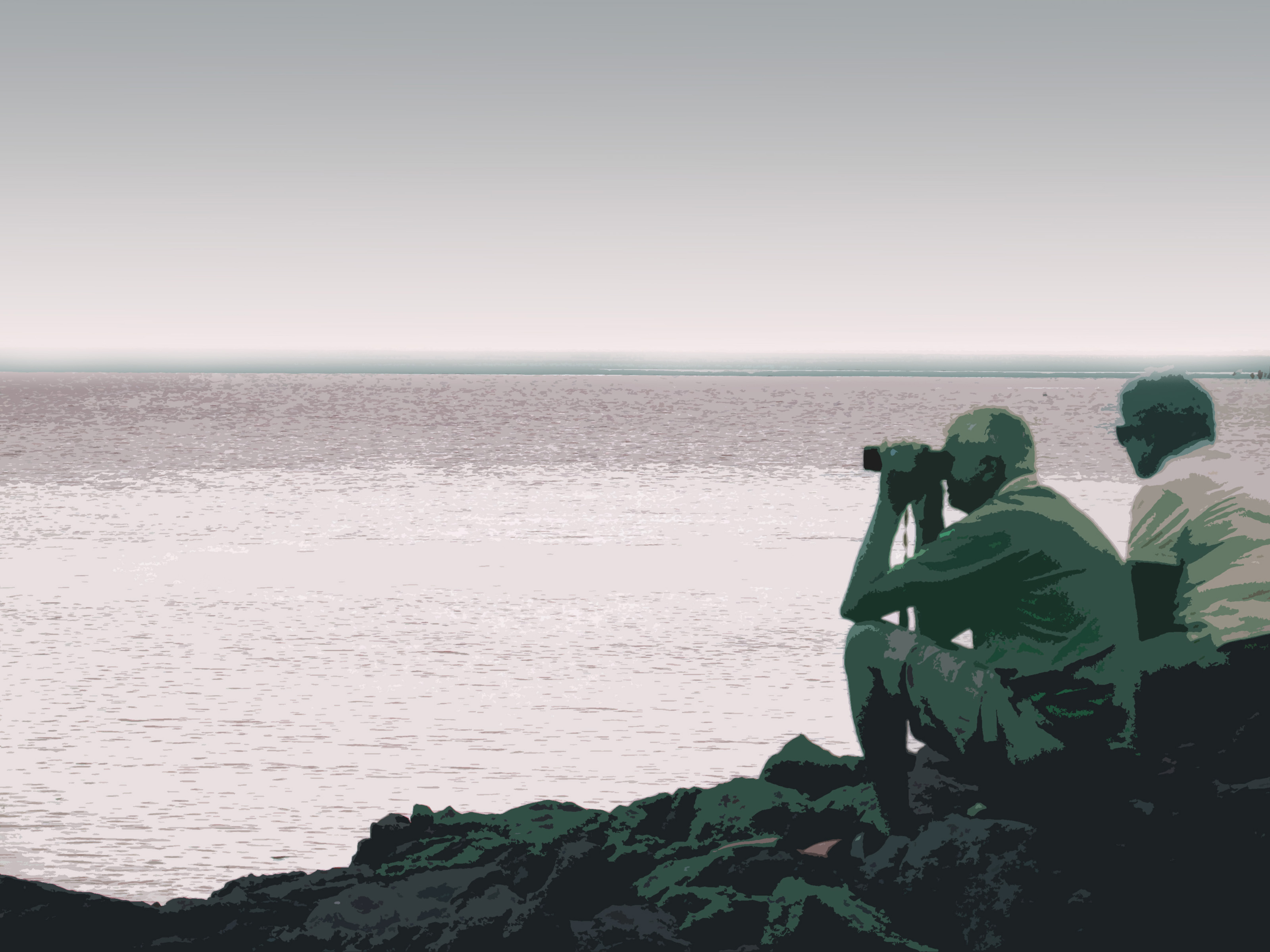 Keywords: graphic, cutout, traced, illustrated, water, oceanscape, colourised, pink, people, binos, binocular, distance, looking, sat, sitting