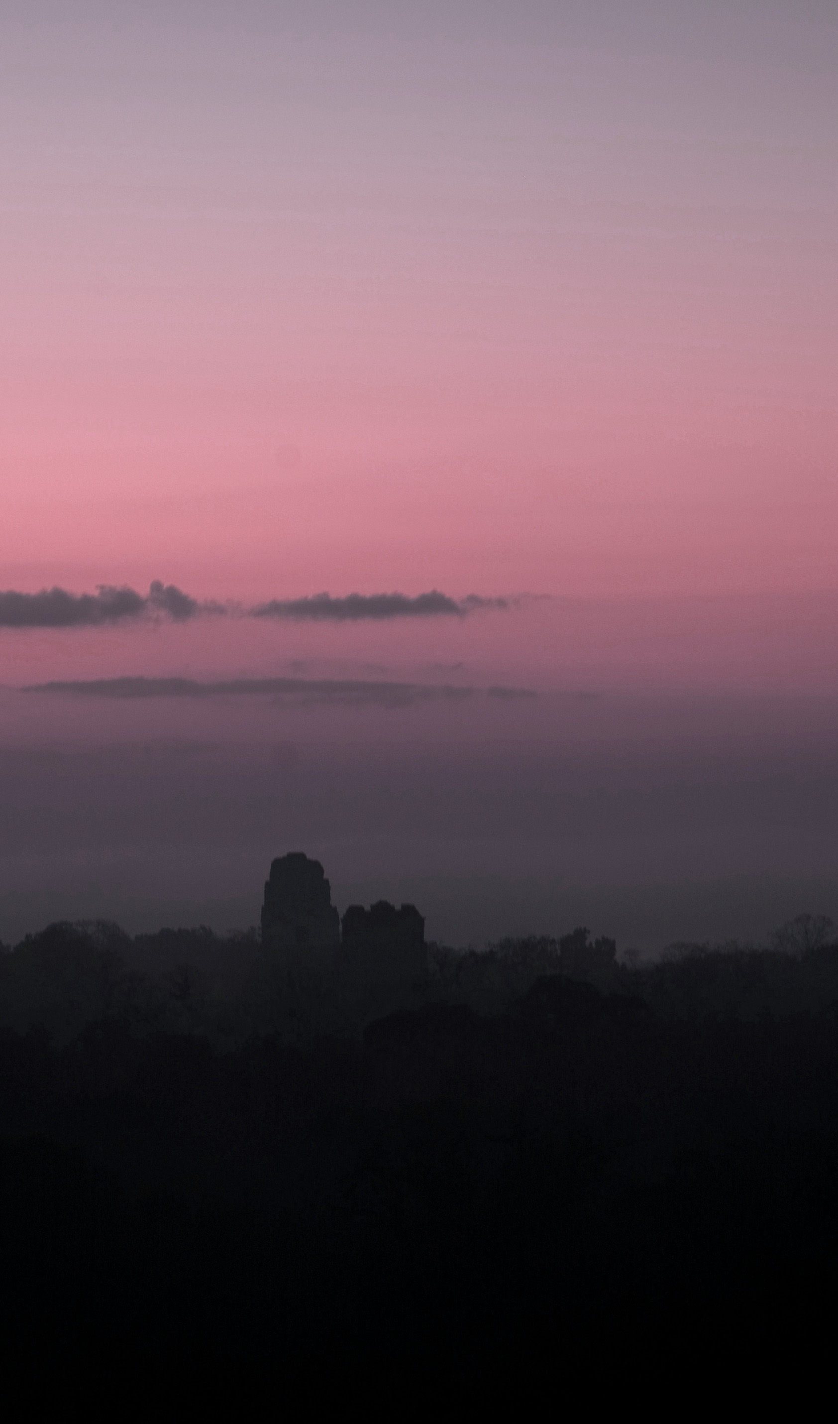 A pink Sunrise over the Temples at Tikal, Guatemala