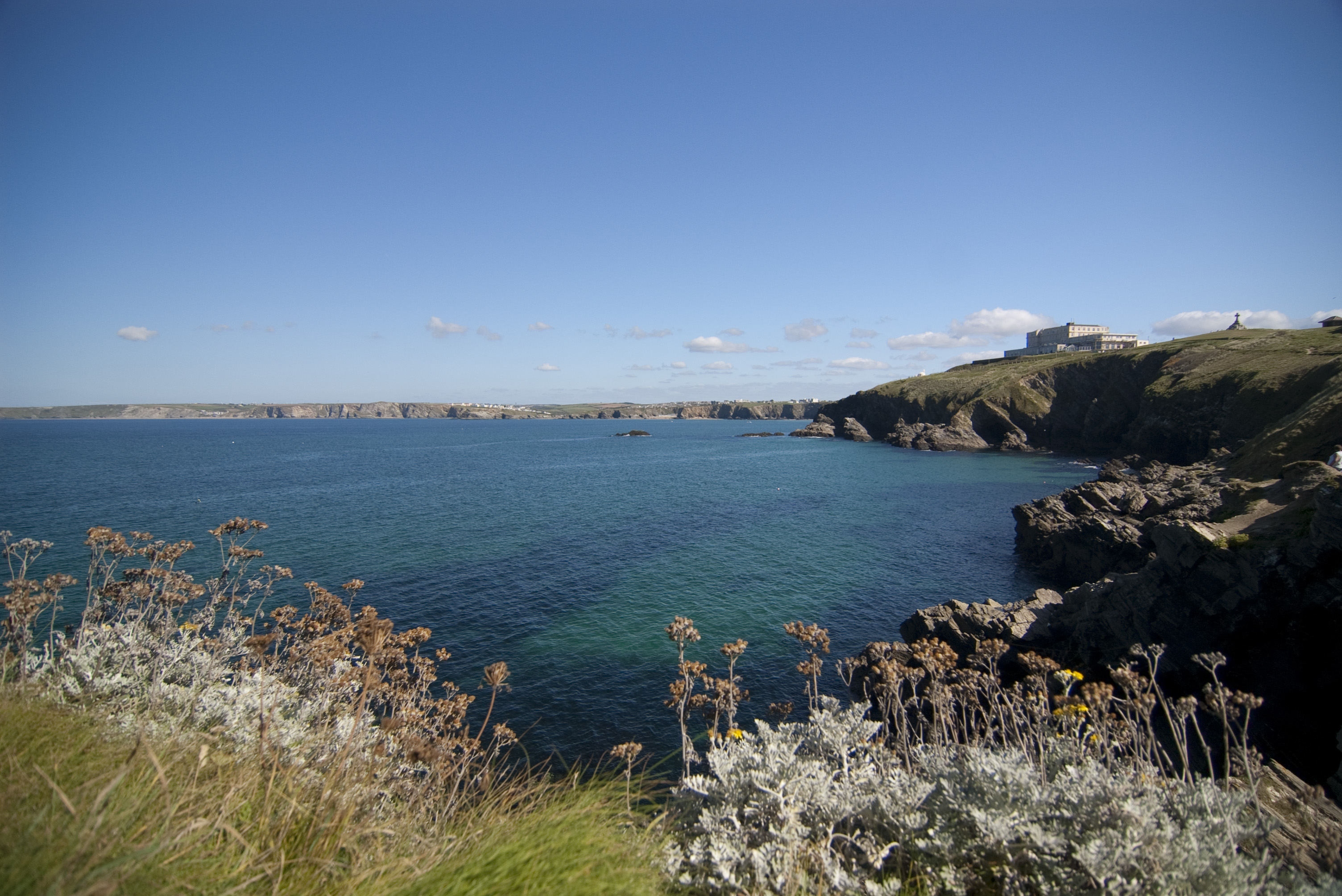 Keywords: cornwall, cornish, towan head, view, vista, summer, plants, cliffs, water, blue, green, aquamarine