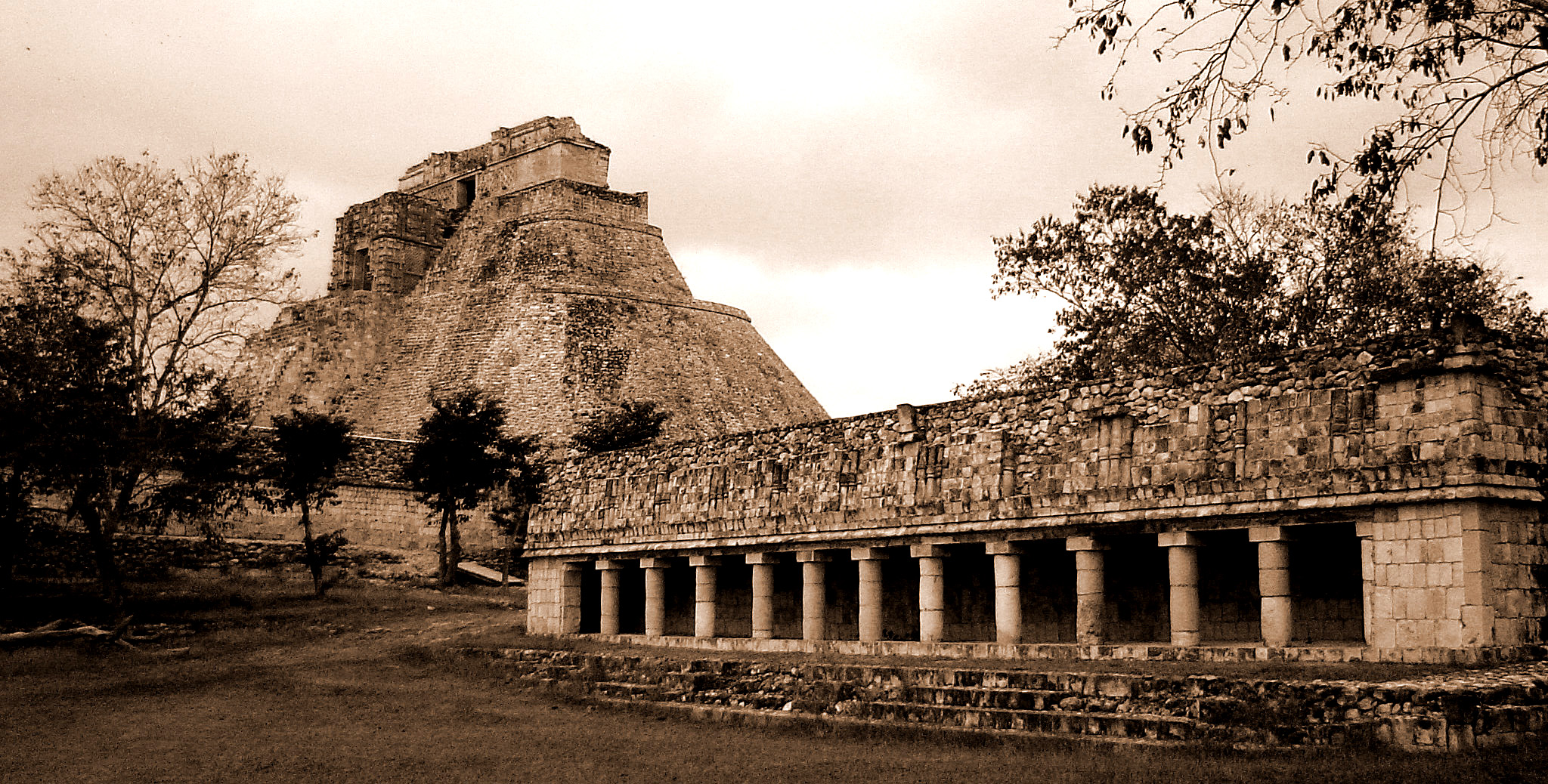 sepia toned image of the temples at Uxmal, including the Pyramid of the Magician