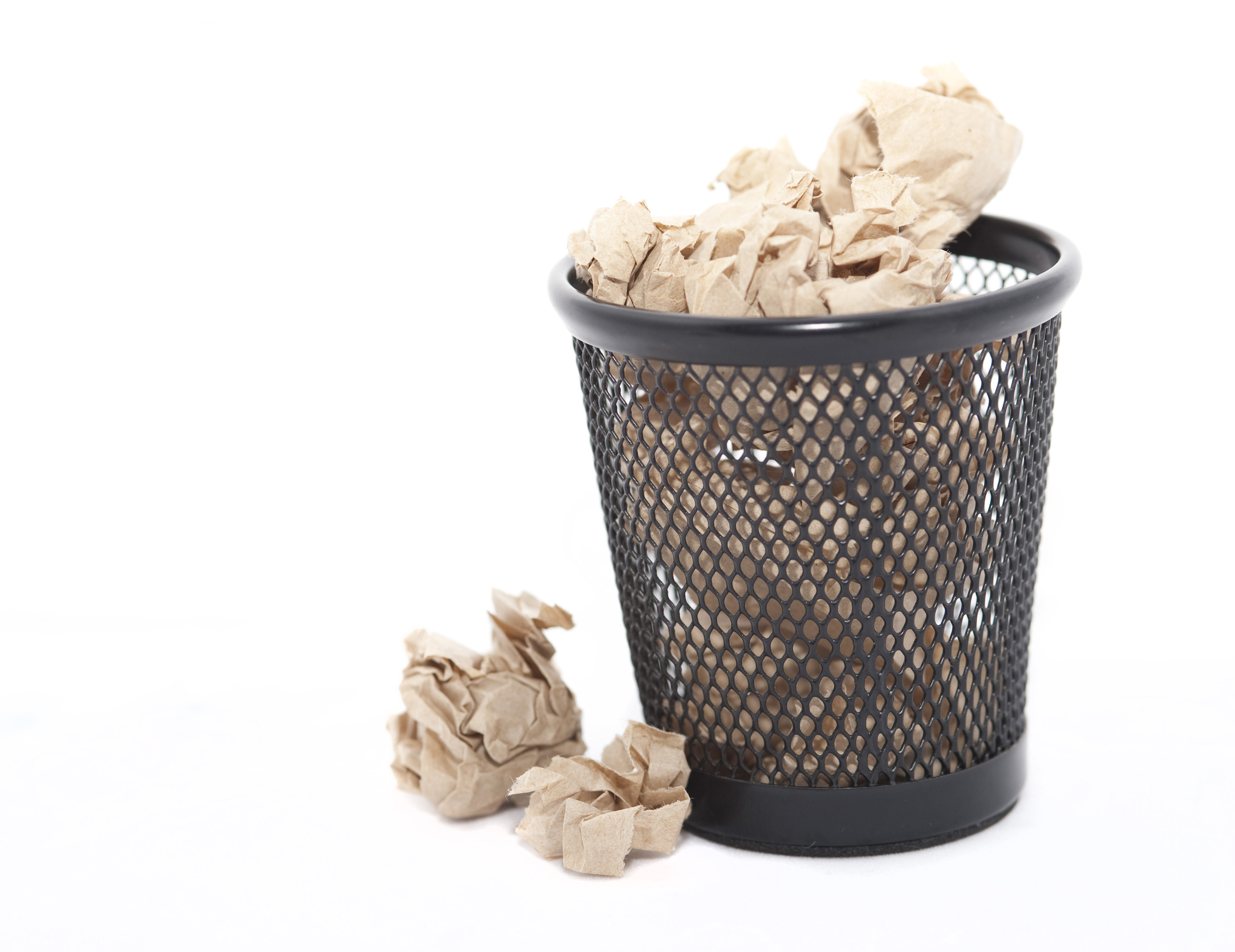 Crumpled waste paper in a bin which is full and overflowing on to the floor