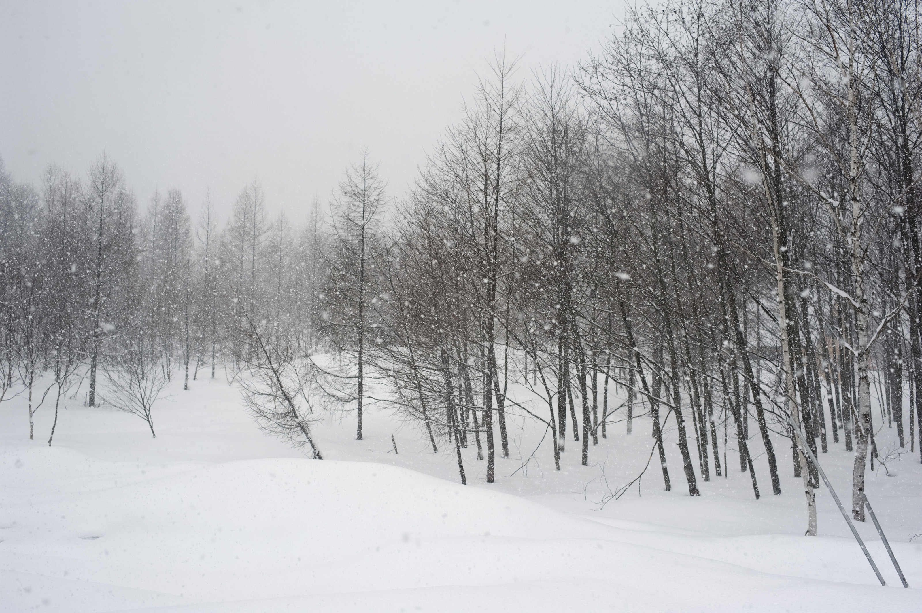 snow falling on a woodland of leafless winter trees