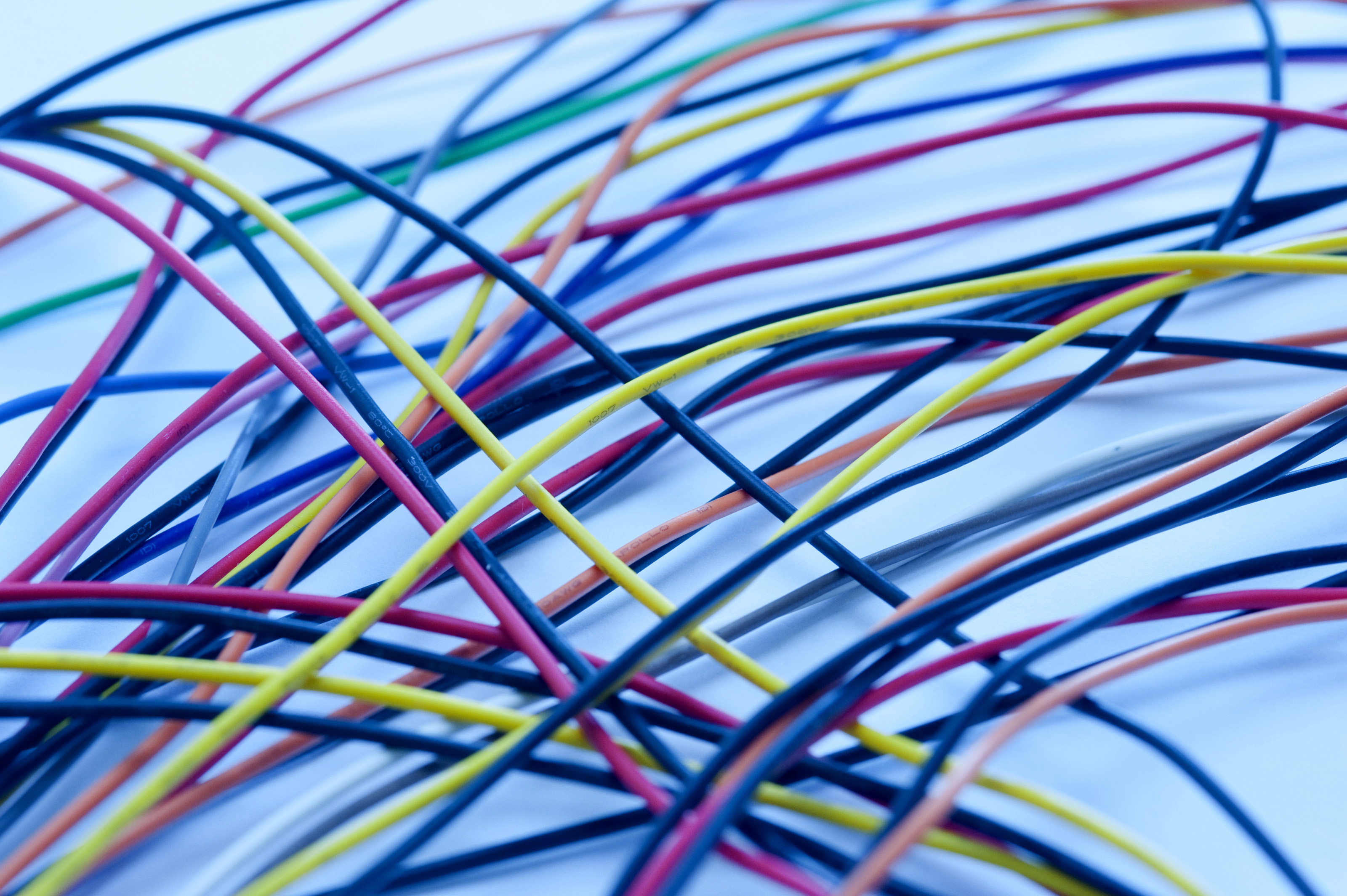 Keywords: colorful, wires, crossed, tangled, blue, cool tone, close up, communication, connection, technology, red, yellow