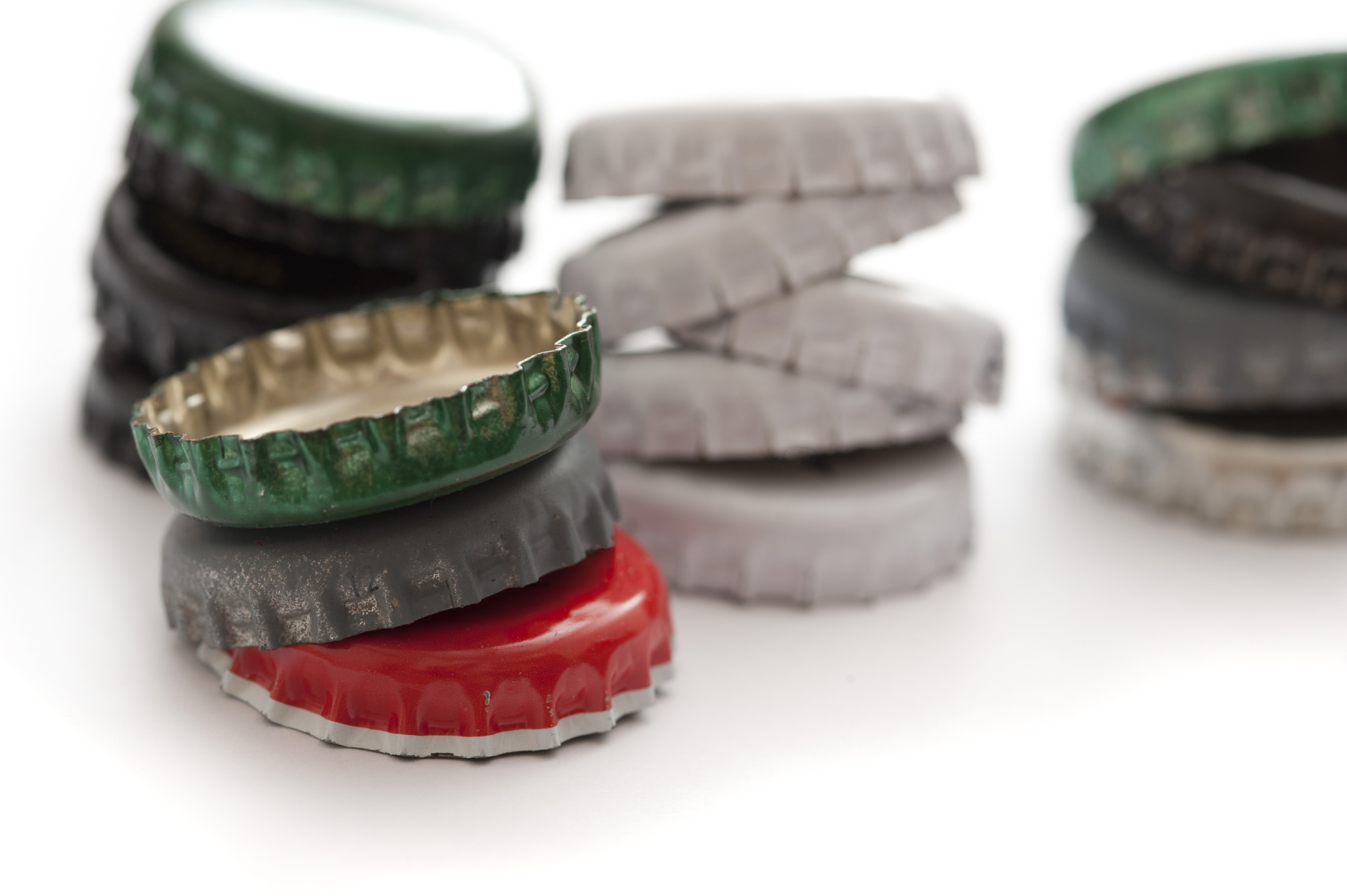 Keywords: bottle, caps, many, stacks, tops, white background, variety, assortment, colorful, alcoholism, concept, soda, beer, copy space, still life, green, red