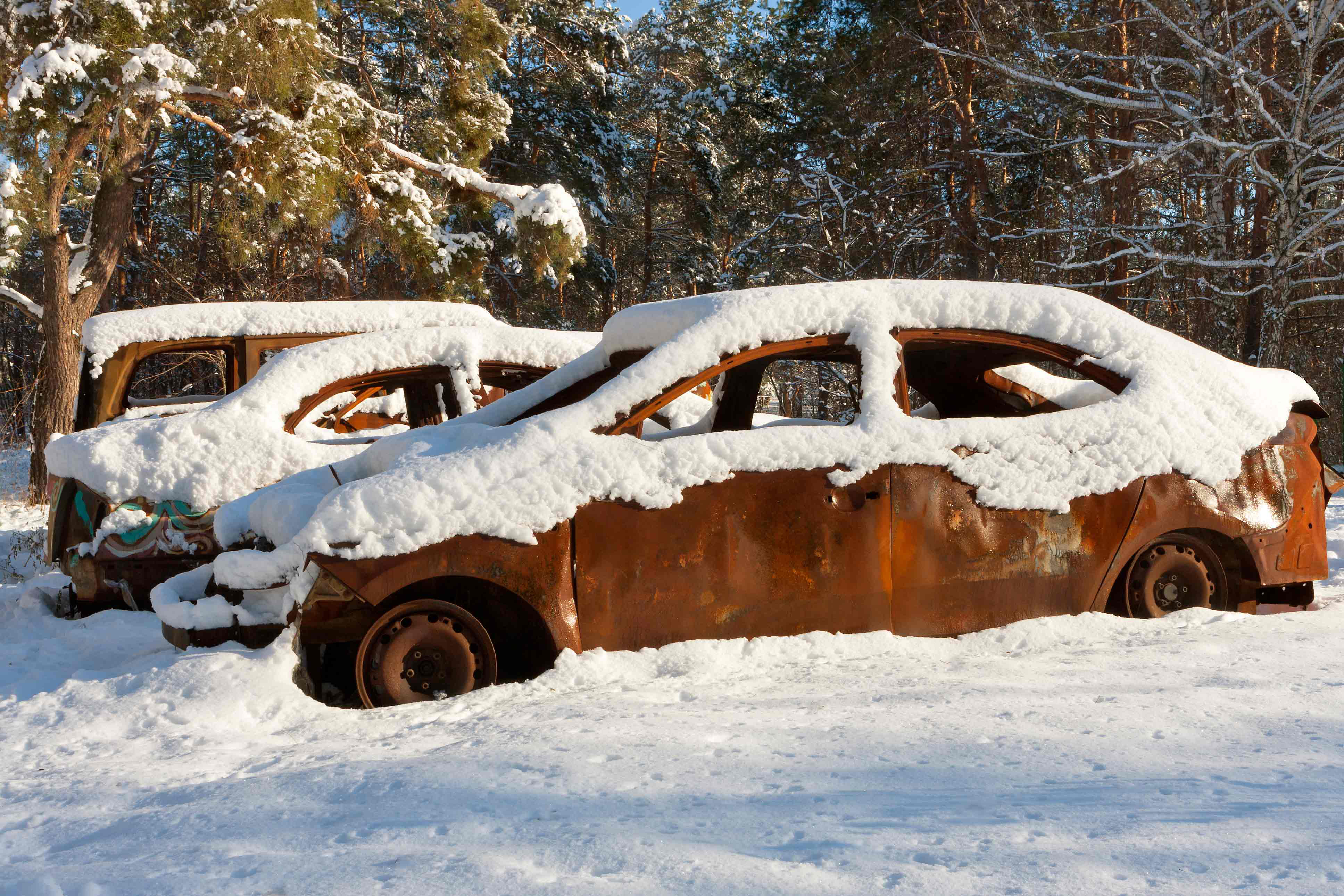 Burnt-out cars covered in snow on a sunny wintery morning against a forest background