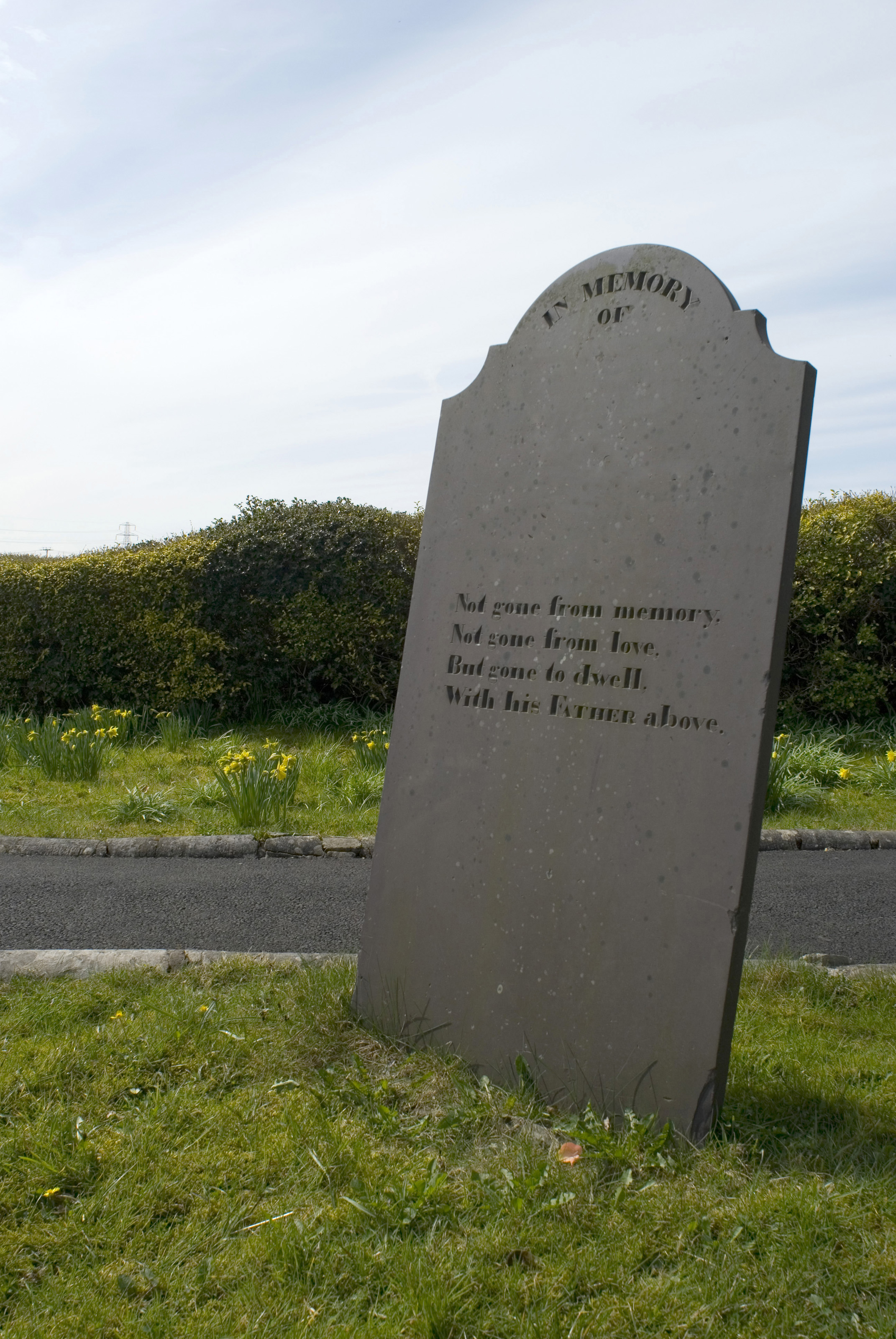 Blank headstone with poetic inscription standing at an angle alongside a small rural lane in open countryside