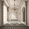 Decorative mosaic ceiling with a classical inlaid pattern in muted pastel colours in a vestibule or atrium inside a building with arched doorways
