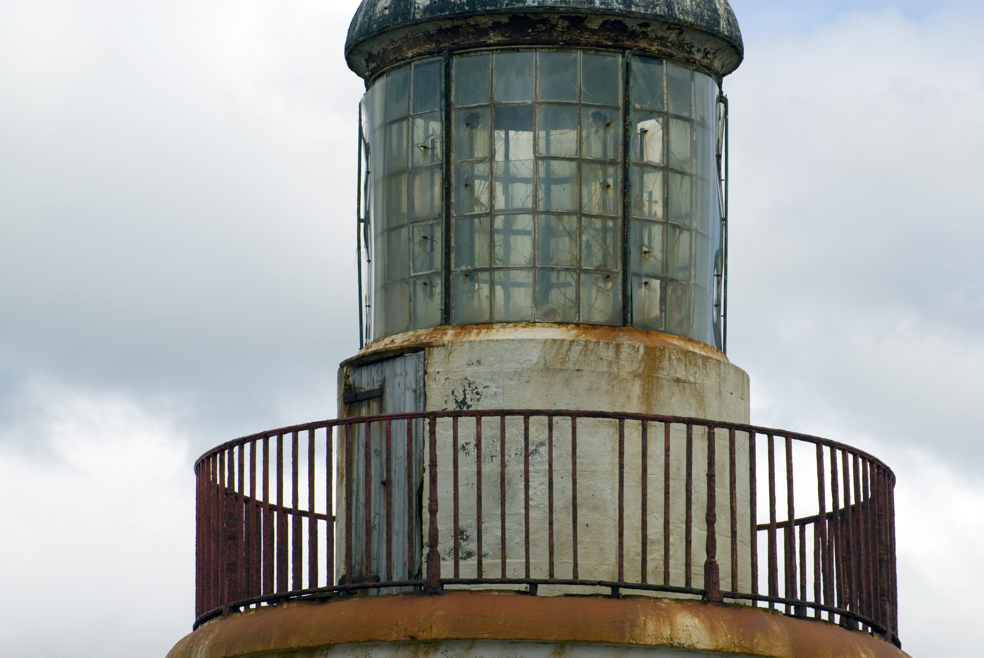 Closeup view of the lantern or lamp room of an old lighthouse against a cloudy sky