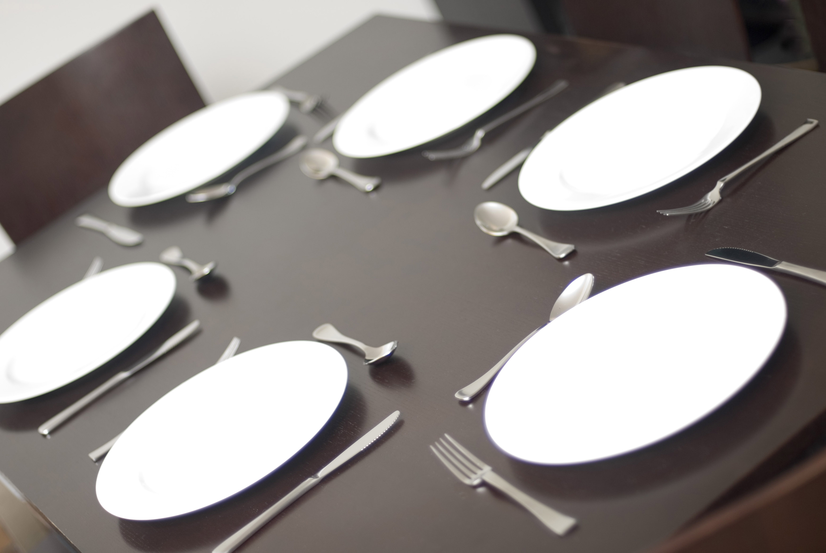 Keywords: clean, dining, dinner, empty, family, laid, place setting, plates, six, table, catering, cutlery, utensils, tilted, restaurant
