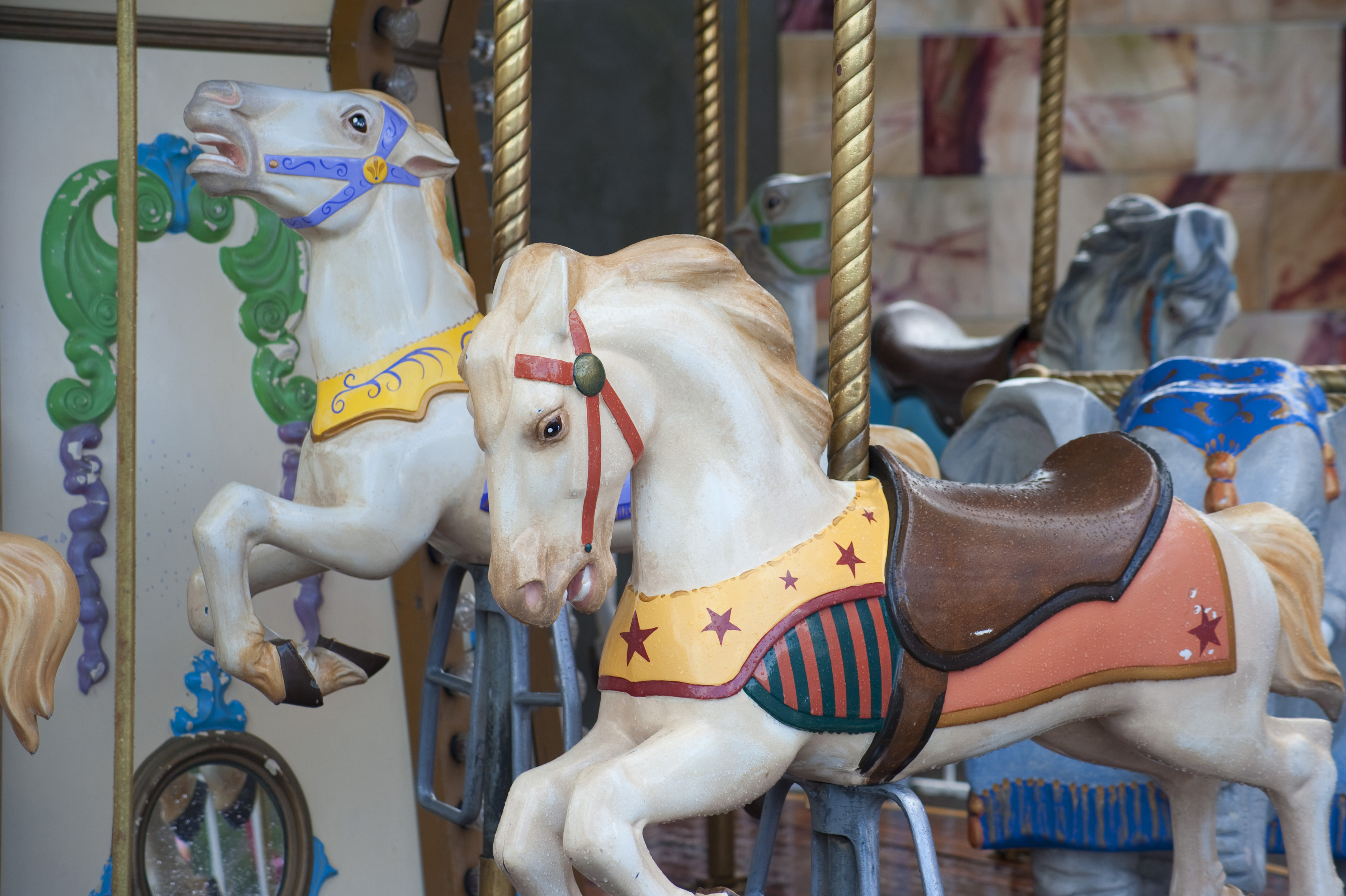 Close up detail of colorful carousel horses on a merry-go-round at a fairground or amusement park