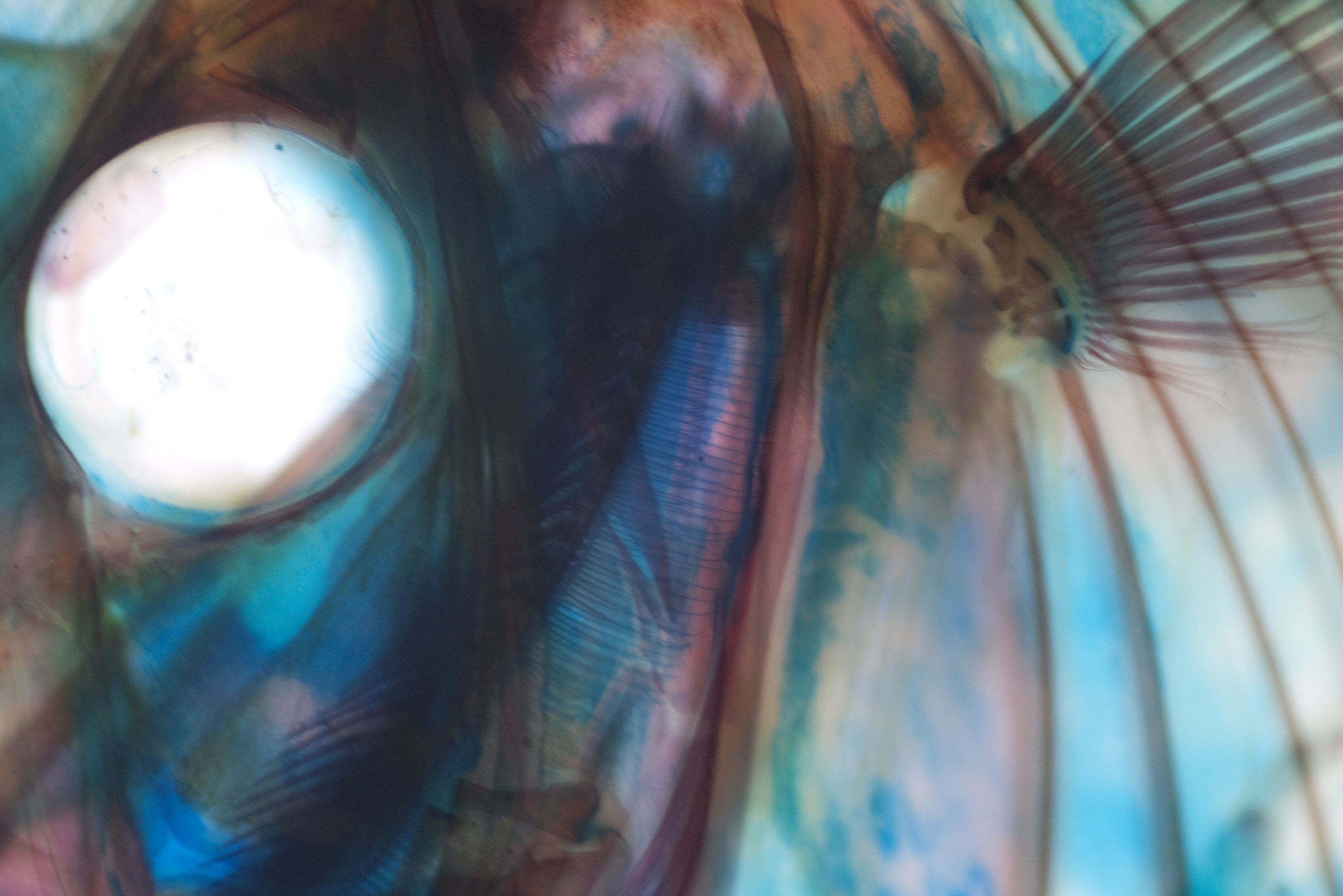 Keywords: sicence, biology, animal, fish, skeleton, skeliton, stained, stain, dye, dyed, bones, flat, mounted, eye, colourful