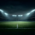 Floodlit night event with crowds of people walking across an open field illuminated by a row of powerful floodlights facing towards the camera in the darkness