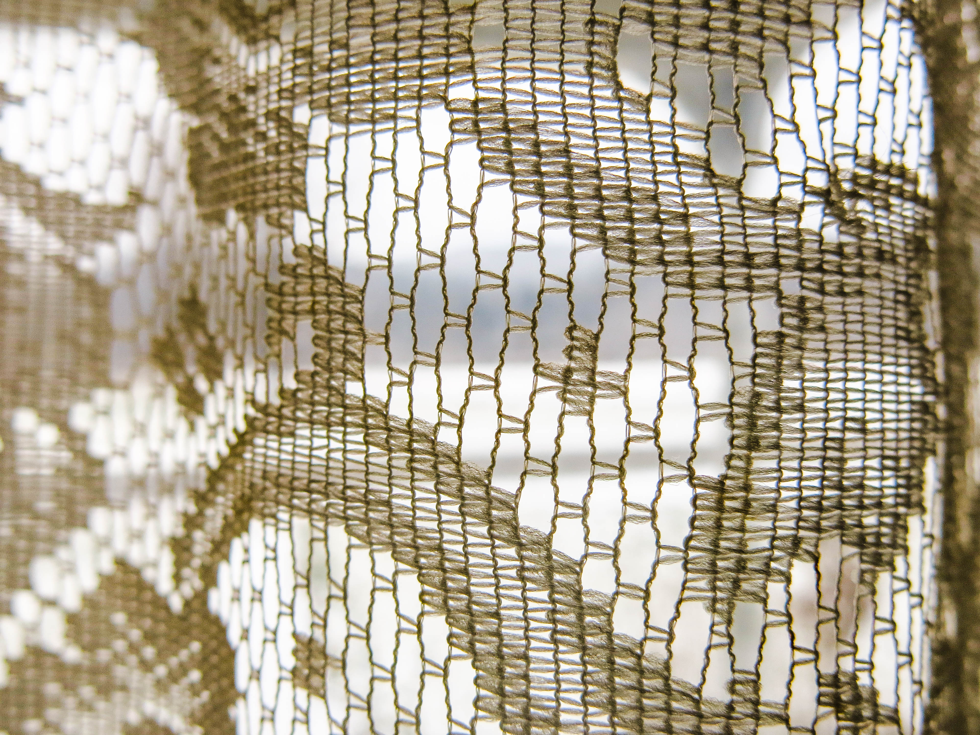 Macrame lace window treatment curtain close up and intimate.