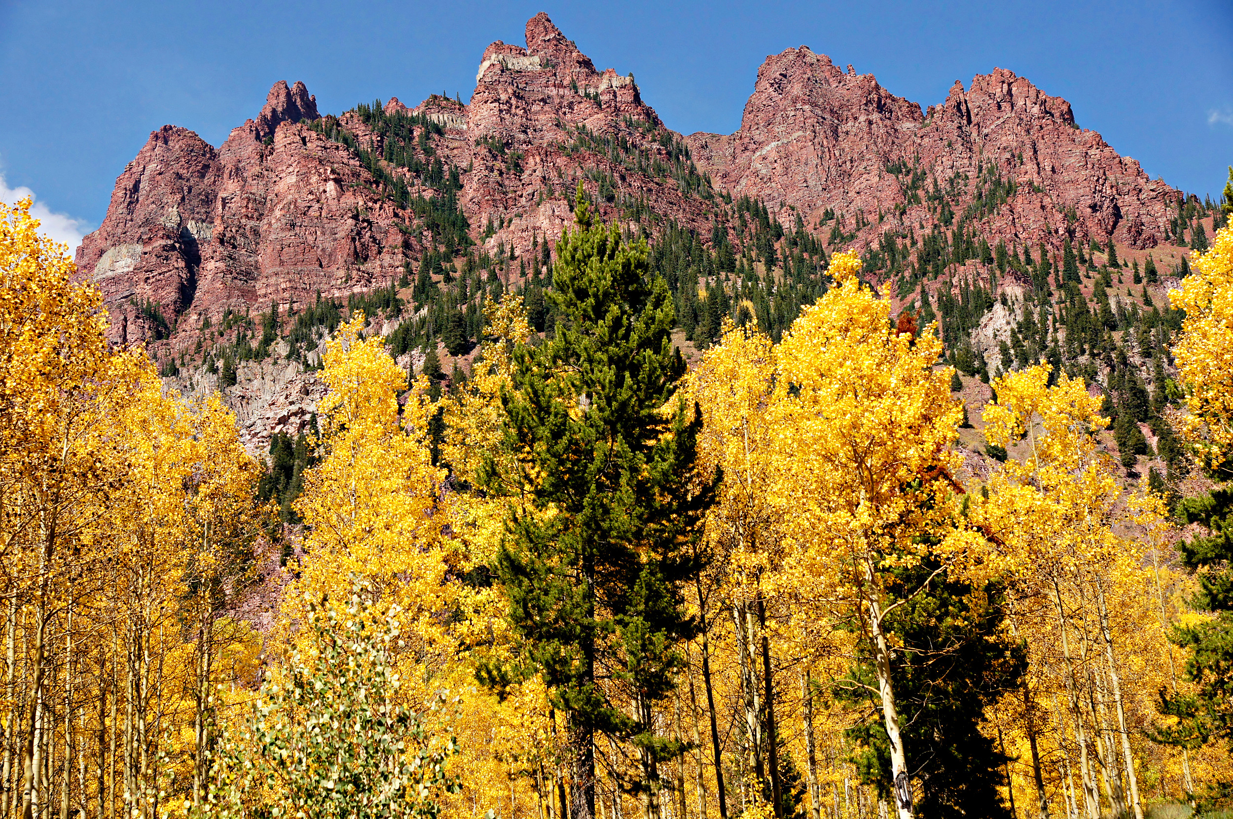 Keywords: Maroon, Bells, Lake, Colorado, jagged, spires, autumn, gold, golden, yellow, aspen, trees, blue, sky, skies, fall, leaves, color, colorful, turning, rocky, mountains, rockies, autumnal, foliage, sunlight, bright, forest,pine
