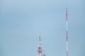 Two telecommunications towers with transmitters and receivers for mobile phones on a grey cloudy day