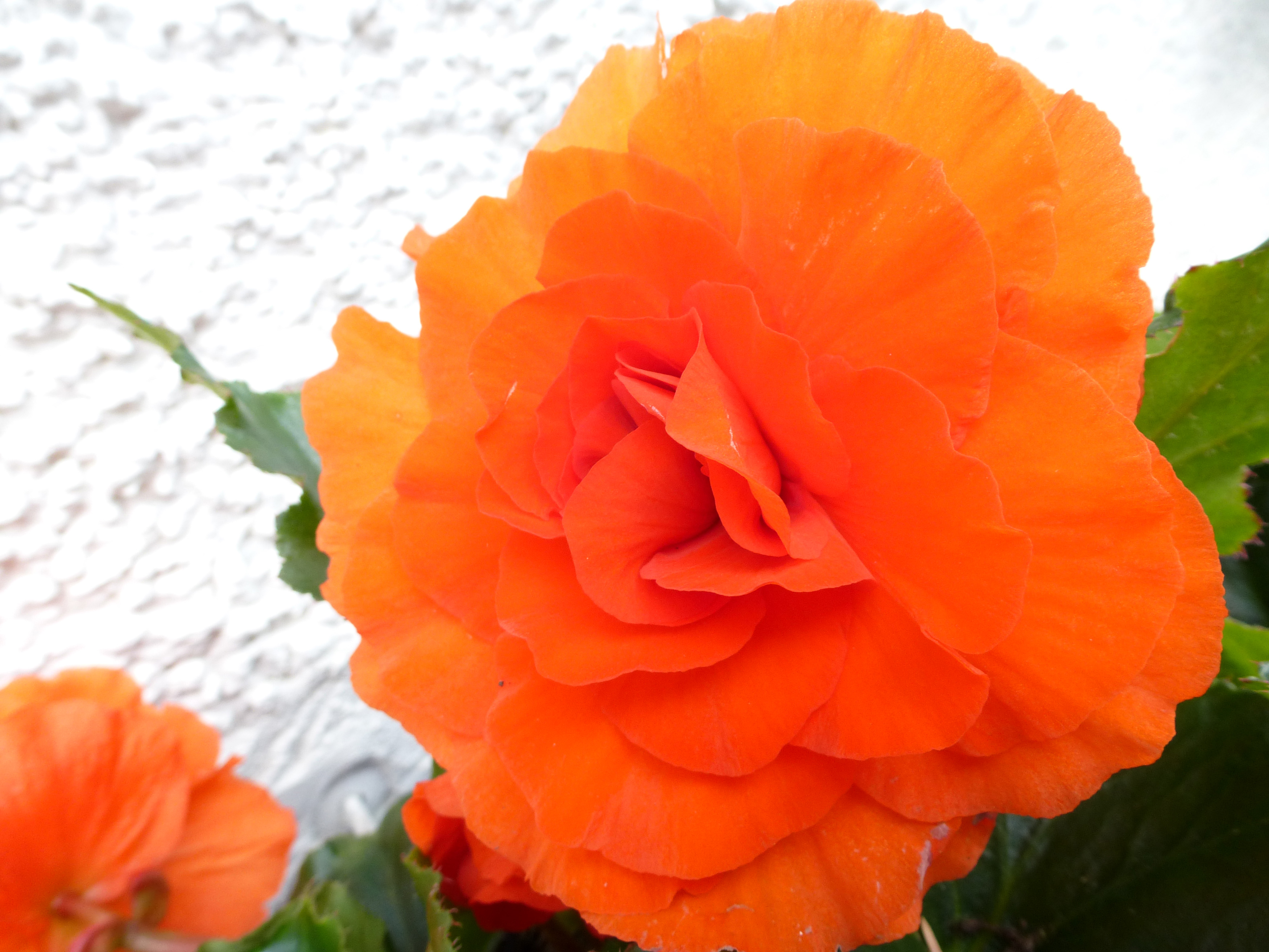 Keywords: begonia, bright, orange, outdoors, big, close up, flower, large, stucco wall, red, bloom, flowering