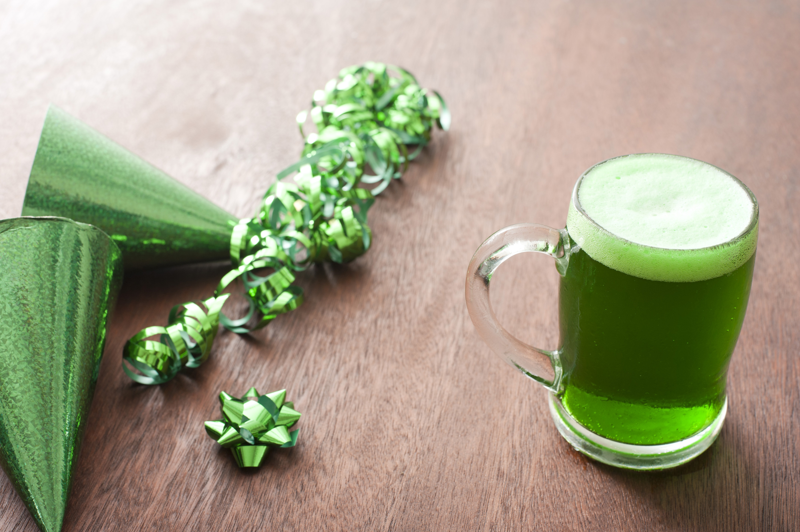 12098 Green party hats, ribbons and beer on table - this image by stockmedia.cc is licensed under a Creative Commons Attribution 3.0 Unported License.