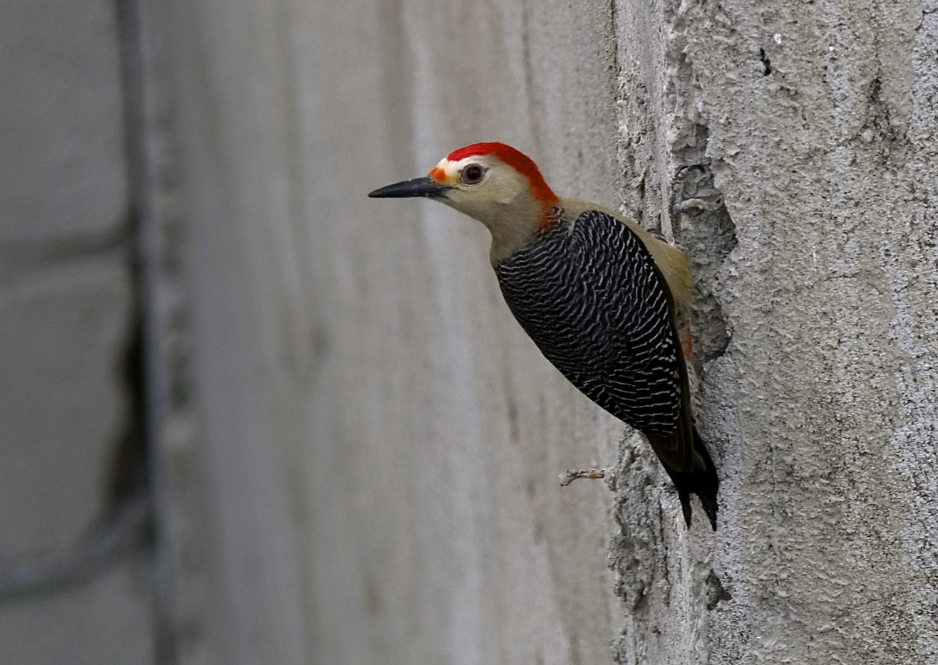 Keywords: Guatemala, red-bellied woodpecker, red head, colour, bird, wood pecker, wall, feathers, looking, eye